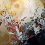 But Miller and her art have stretched beyond the simple label of The Chair Lady. For one, her subject has shifted. Her mixed media work, which often includes bits of fabric, quilts, or other found materials, now features floral images, while maintaining the layering and abstractness of her style. Secondly, Miller’s work has garnered significant attention in the last decade. At festivals and art shows – Miller travels with her work 20 weekends each year, sometimes with her family – she has been named a finalist for the William and Dorothy Yeck Purchase Award in the Young Painters Competition at Miami University in 2016, Best in Show at the Virginia Museum of Contemporary Art Boardwalk Art Show in 2016 and 2023, and selected for a solo show at VaMOCA’s Runnymede Gallery in 2017. Her work has been published in the magazine Studio Visit, the periodical New American Paintings, and the book Wild Lands by Jen Tough Gallery. Her work has homes in many art collections, both private and corporate, including the Capital One Art Bank private collection.