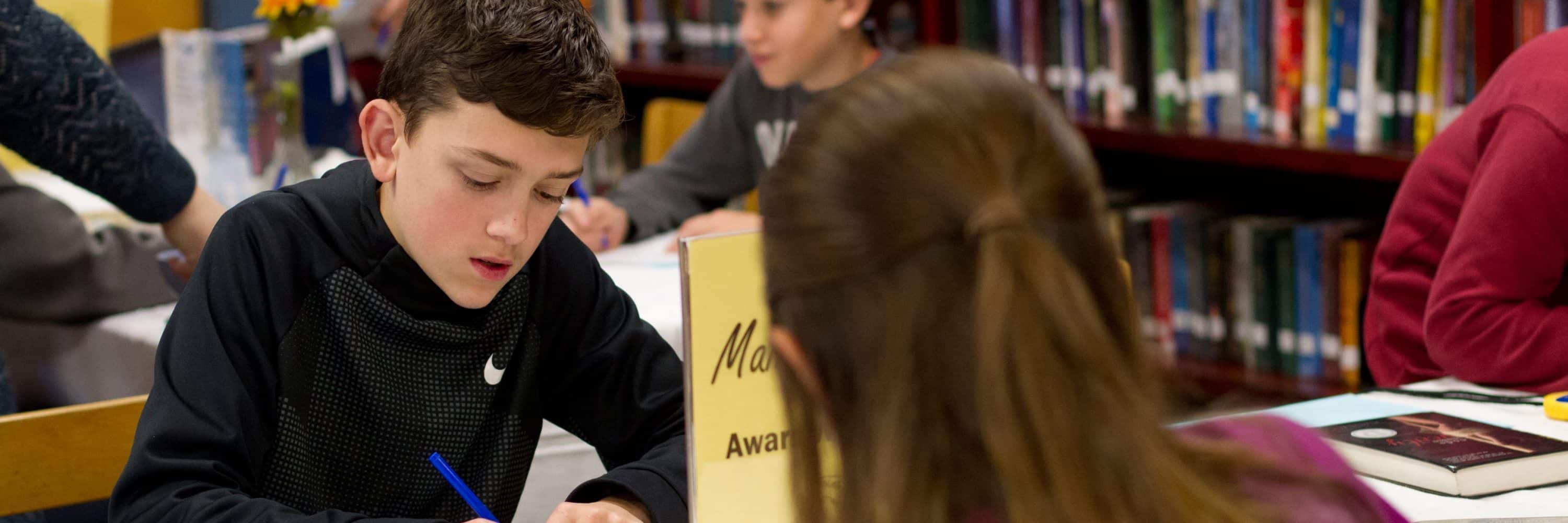 Our middle and high school library provides a space for research, independent study and quiet group work. Students can check out Chromebooks, purchase a hot beverage and enjoy research or writing support from Mrs. Julianne Ross, or other faculty. Mrs. Ross plans themes and activities throughout the year to promote reading, including a DEAR (Drop Everything And Read) week, reading challenges with prizes and more.