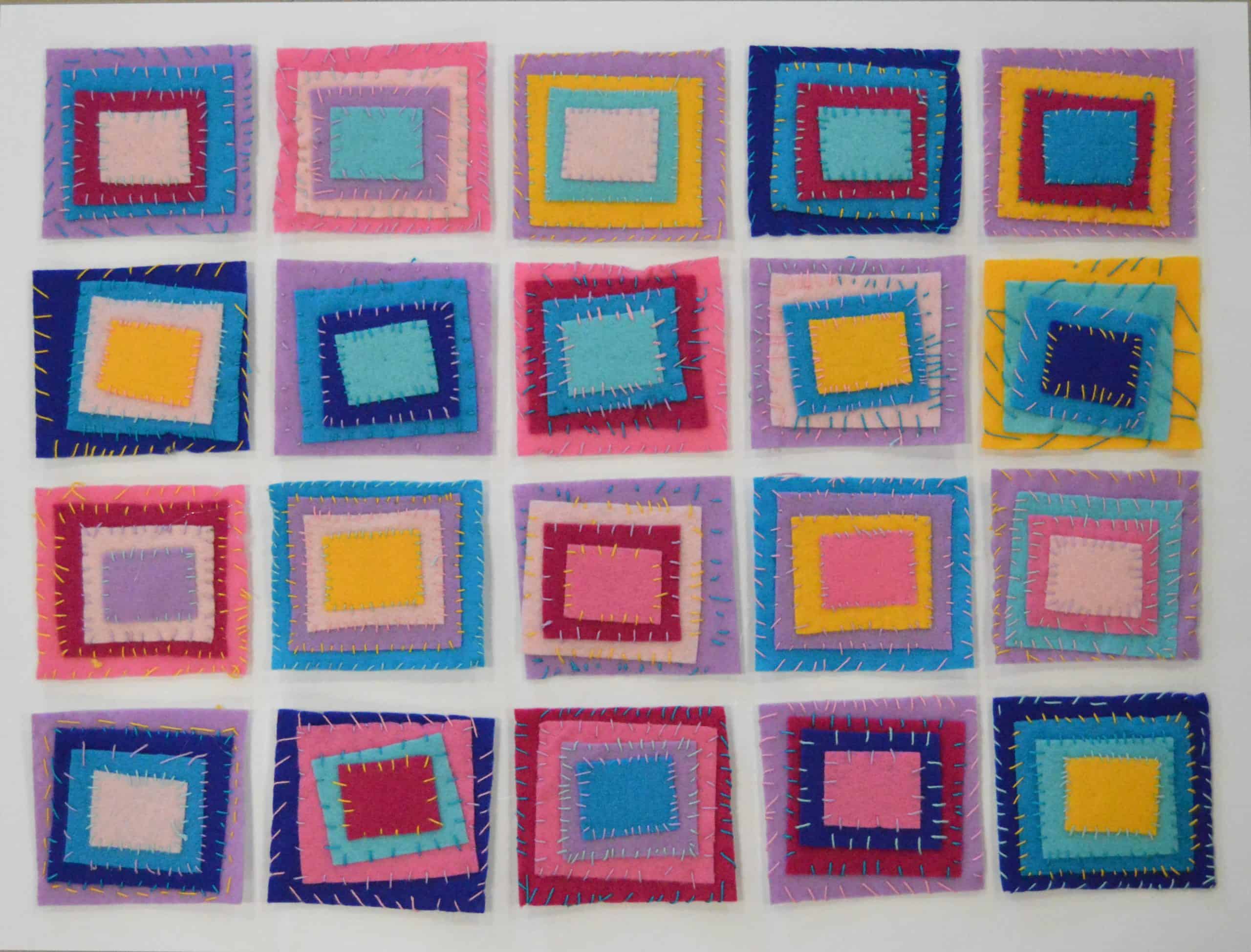 Description: 4th grade artists each designed a series of concentric felt rectangles using the project color scheme. After learning about sewing basics, such as threading a needle and tying a knot, they used a whipstitch to sew their rectangles together. Students took turns hot gluing their felt pieces onto a background to create a quilt effect. As the final step in their creative process, the class brainstormed title ideas for their piece then voted for their favorite.