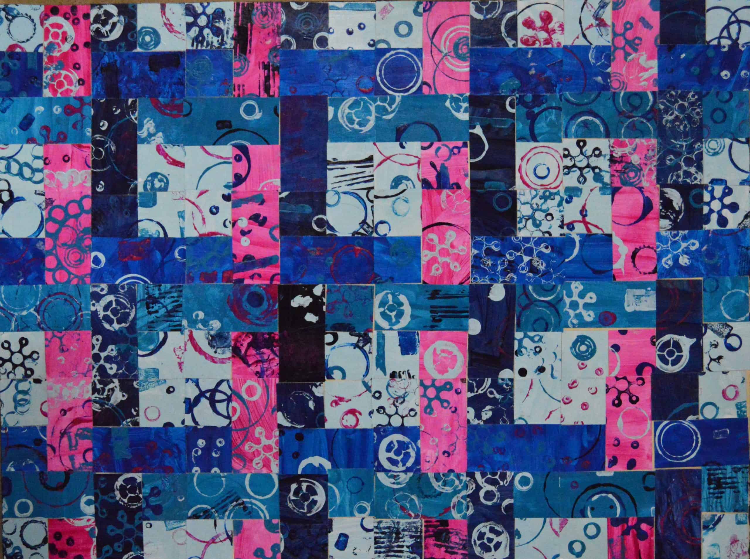 Description: 3rd grade artists each painted five squares of paper a solid background color, then used a variety of tools such as spools, wooden blocks, and lids to create patterns and implied textures. The large squares were cut into a series of smaller squares and rectangles. The artists adhered their individual pieces onto a cradled wooden panel, intermingled with those of their classmates, arranging them into a quilt pattern. As the final step in their creative process, the class brainstormed title ideas for their piece then voted for their favorite.