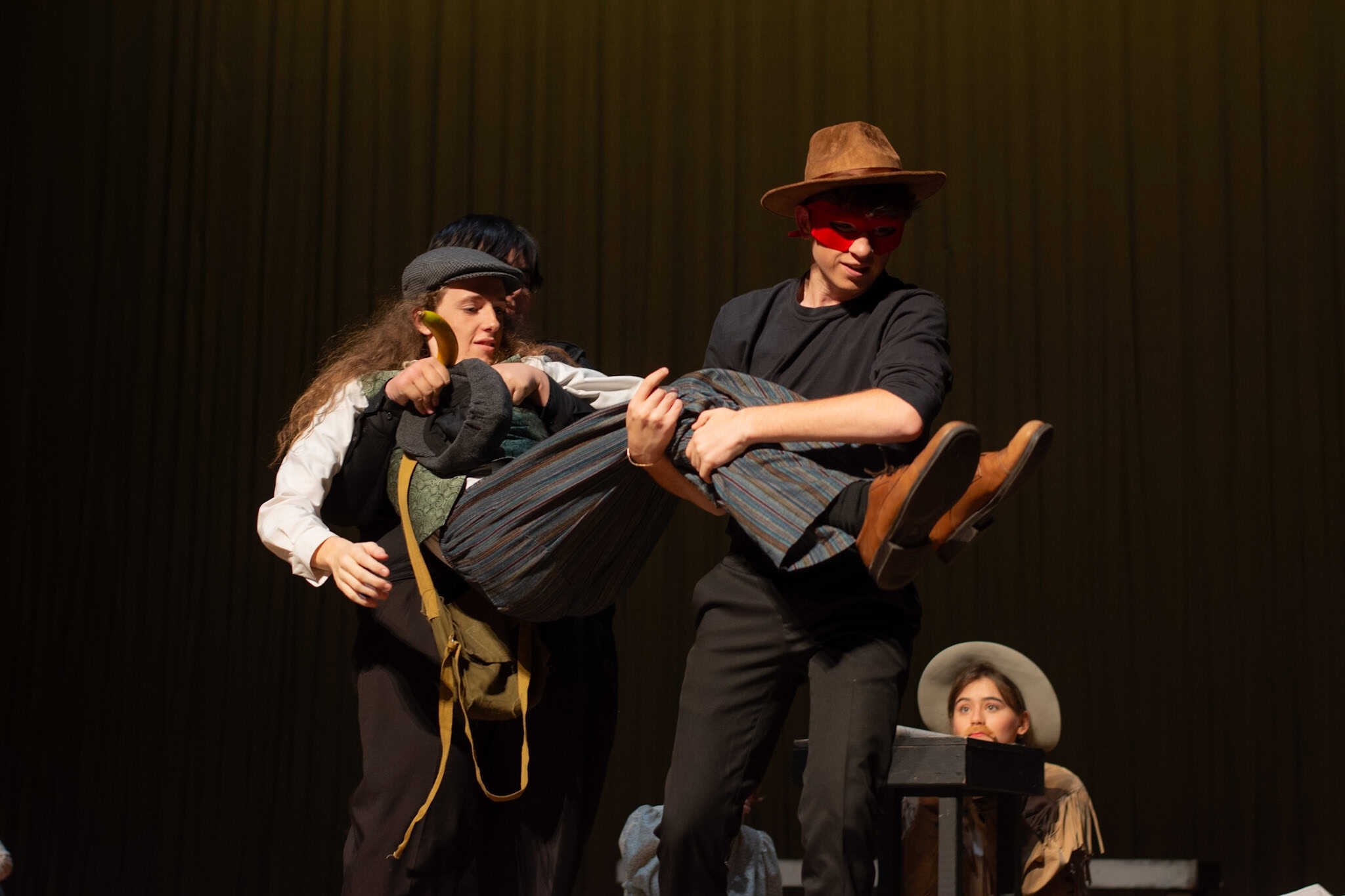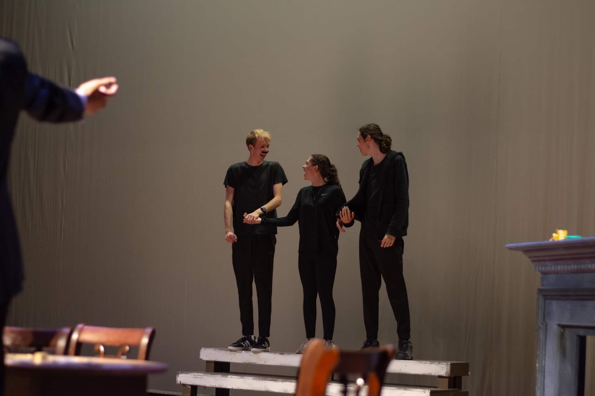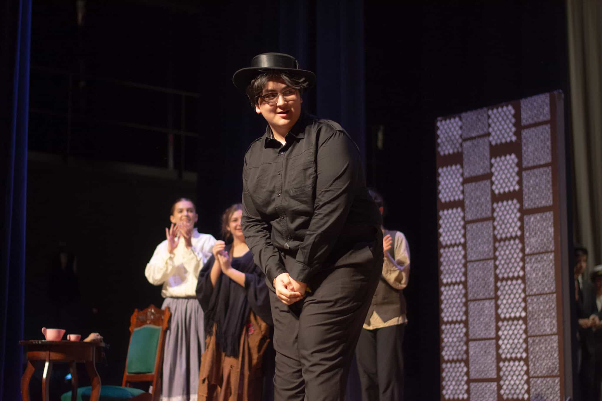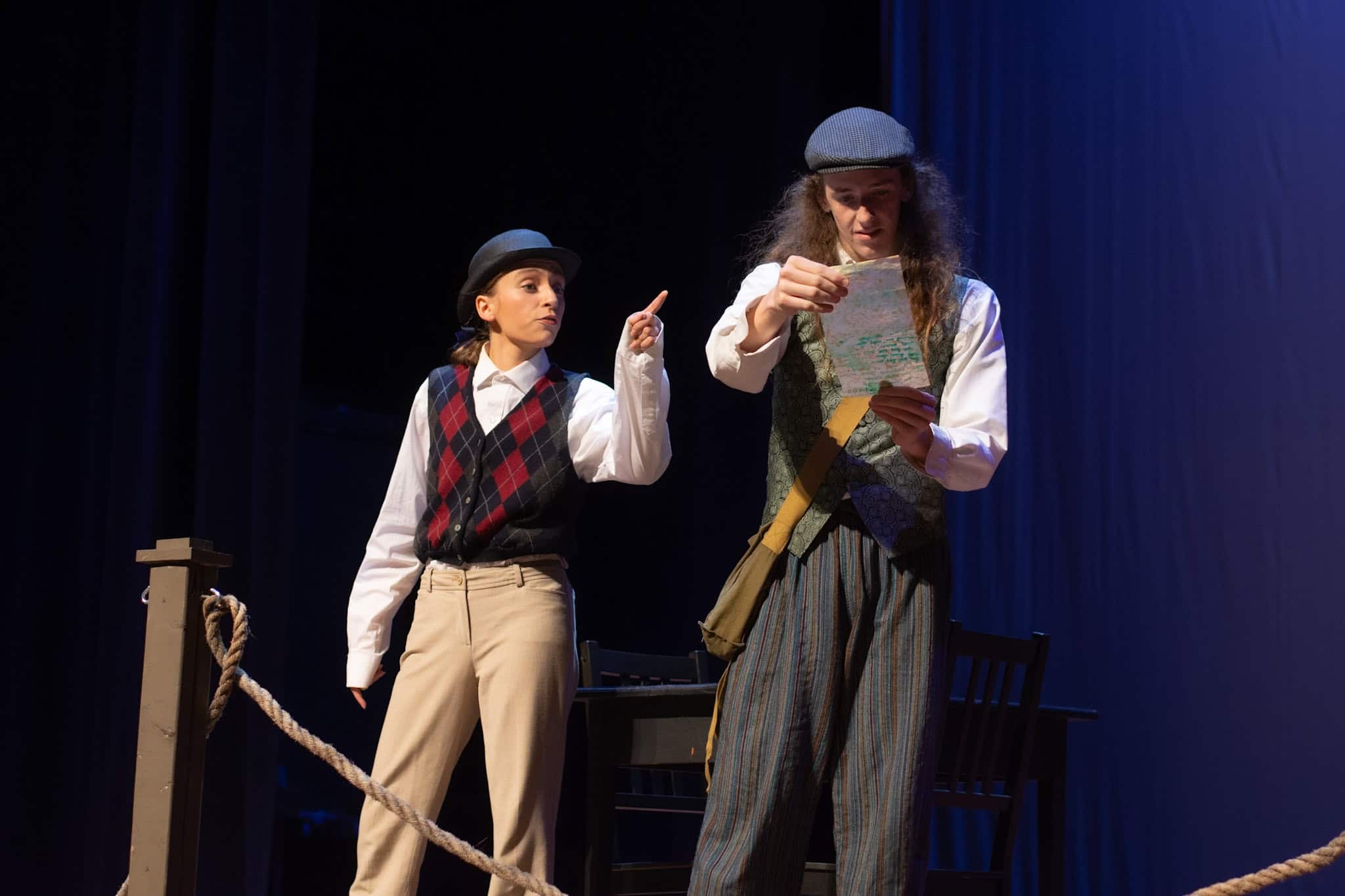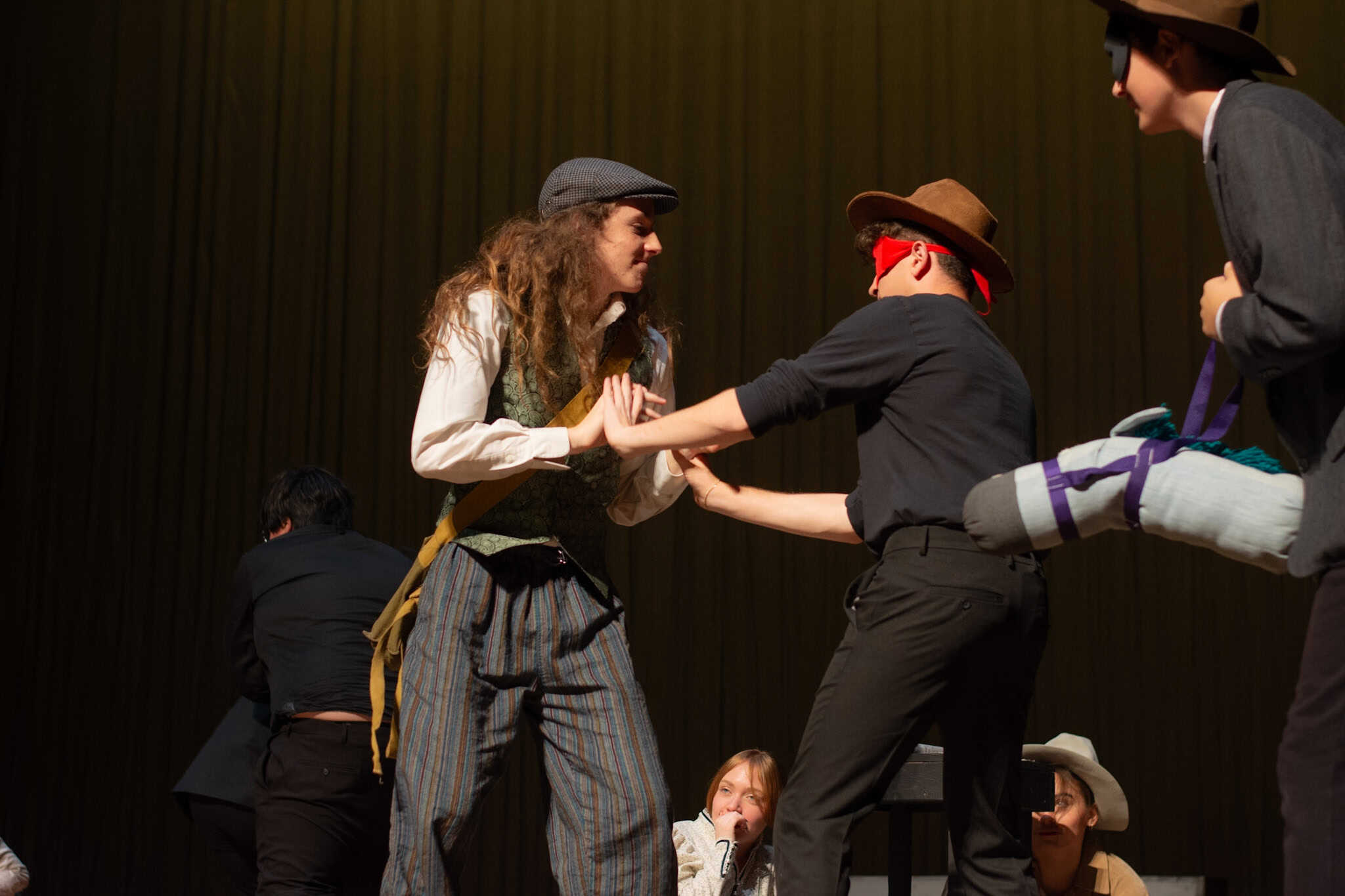 “Uno de mis momentos favoritos fue el bloqueo de la escena de los bandidos en el segundo acto, cuando secuestran a Passepartout. Es un momento tan absurdo. Hay un caballo falso, máscaras, sombreros de vaquero, y los bandidos se llaman John, Johnson, Son, y creo que Johnsonson. Para asegurarnos de que lo teníamos todo controlado y que nadie recibiera un codazo por accidente, lo ensayamos a cámara lenta con todos cayendo al suelo de forma hilarante y gritando '¡Johnson!' a paso de tortuga. Ha sido muy divertido trabajar con los estudiantes y Liz para que los alumnos pudieran encontrar esos momentos absurdos y tomar decisiones divertidas, tanto si al final los incluimos en la obra como si no‘. – Elizabeth Eby, codirectora