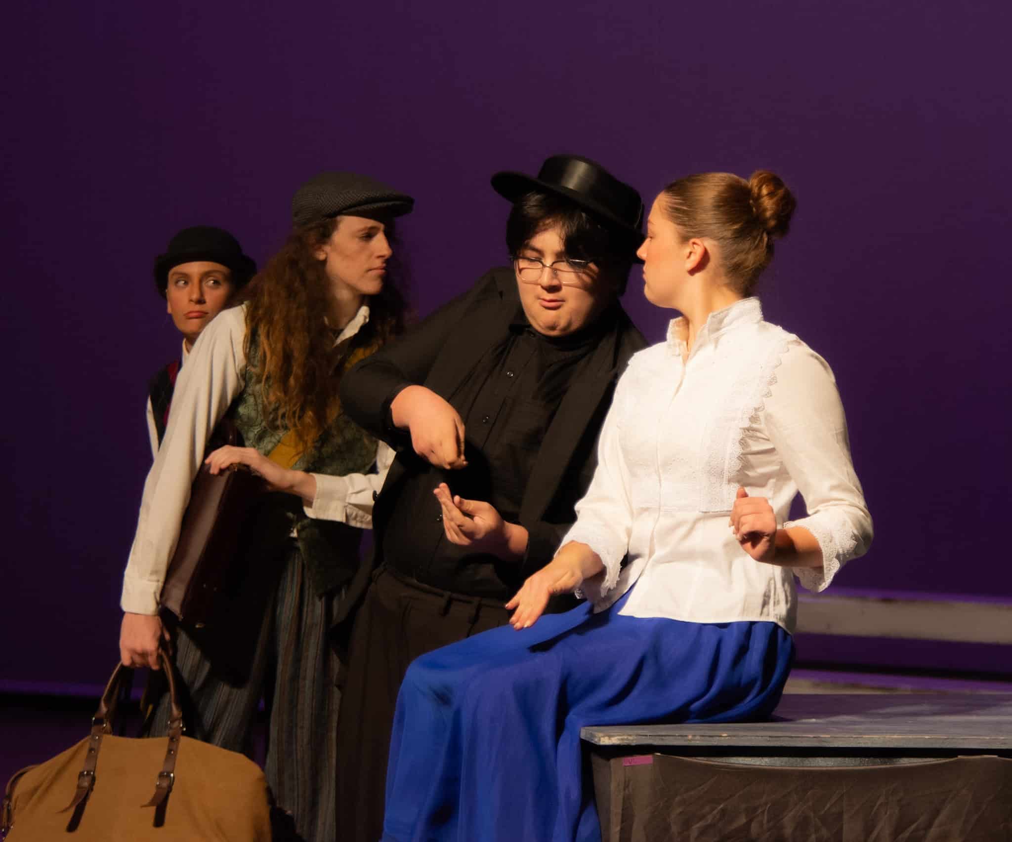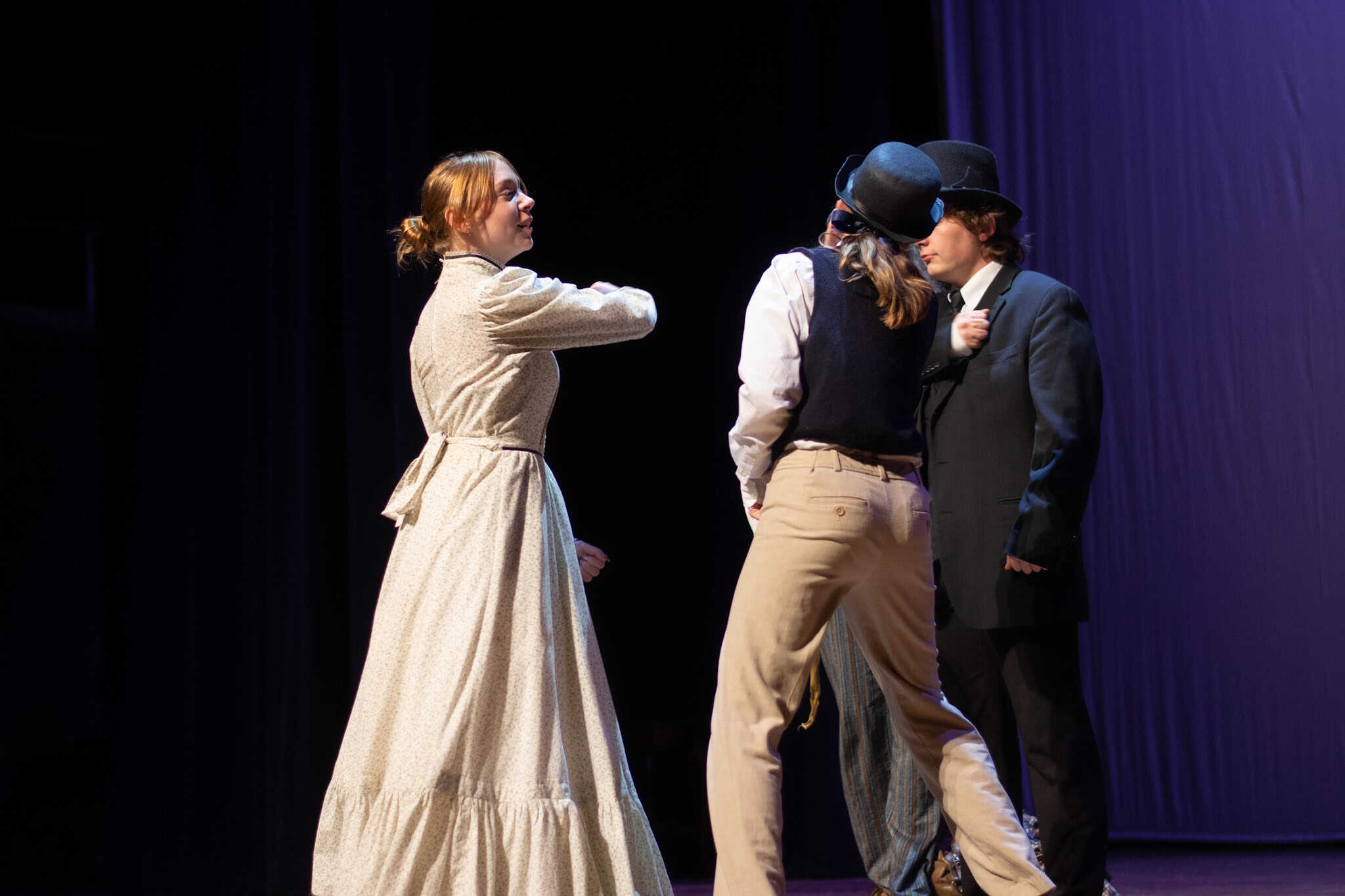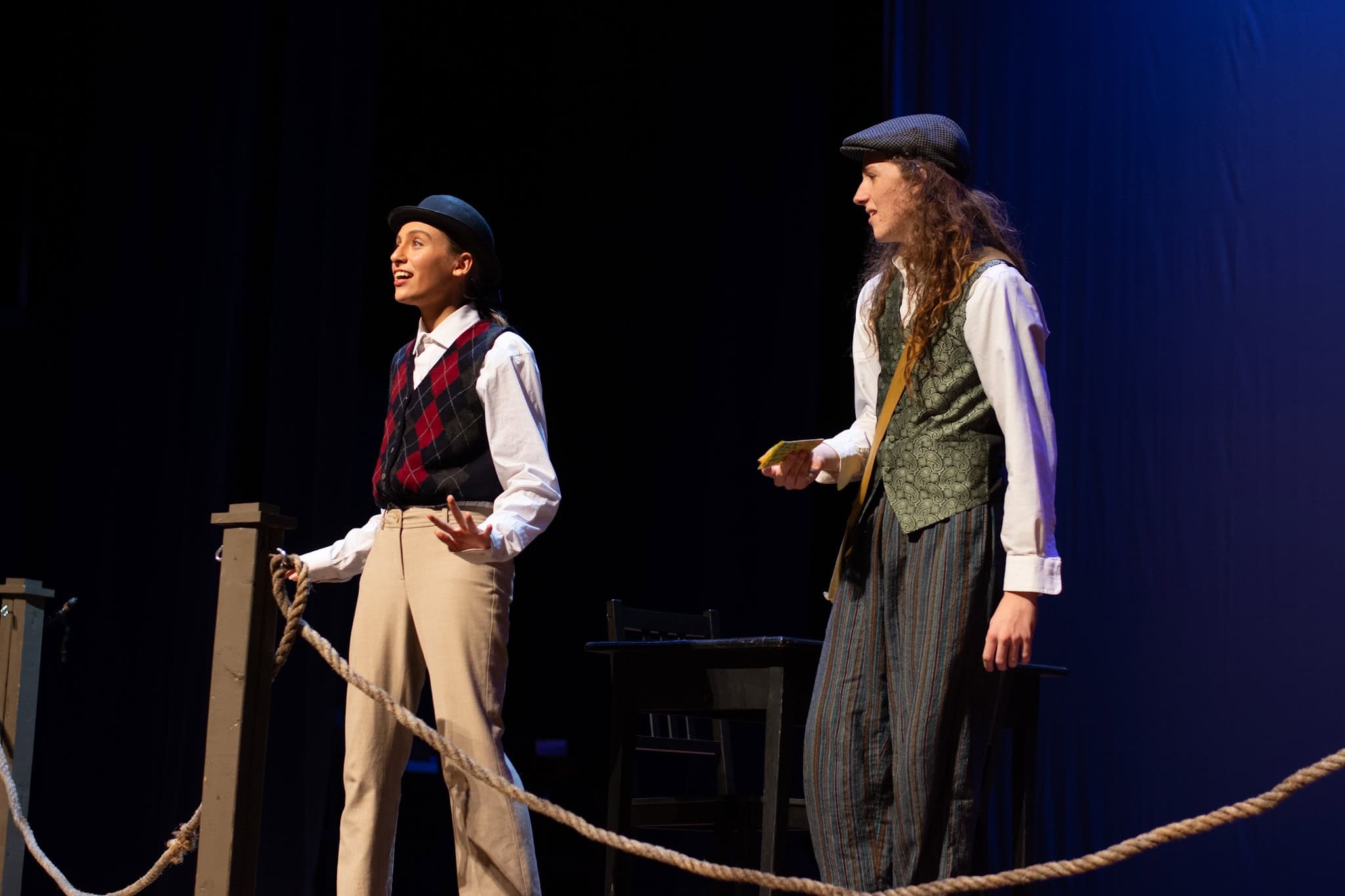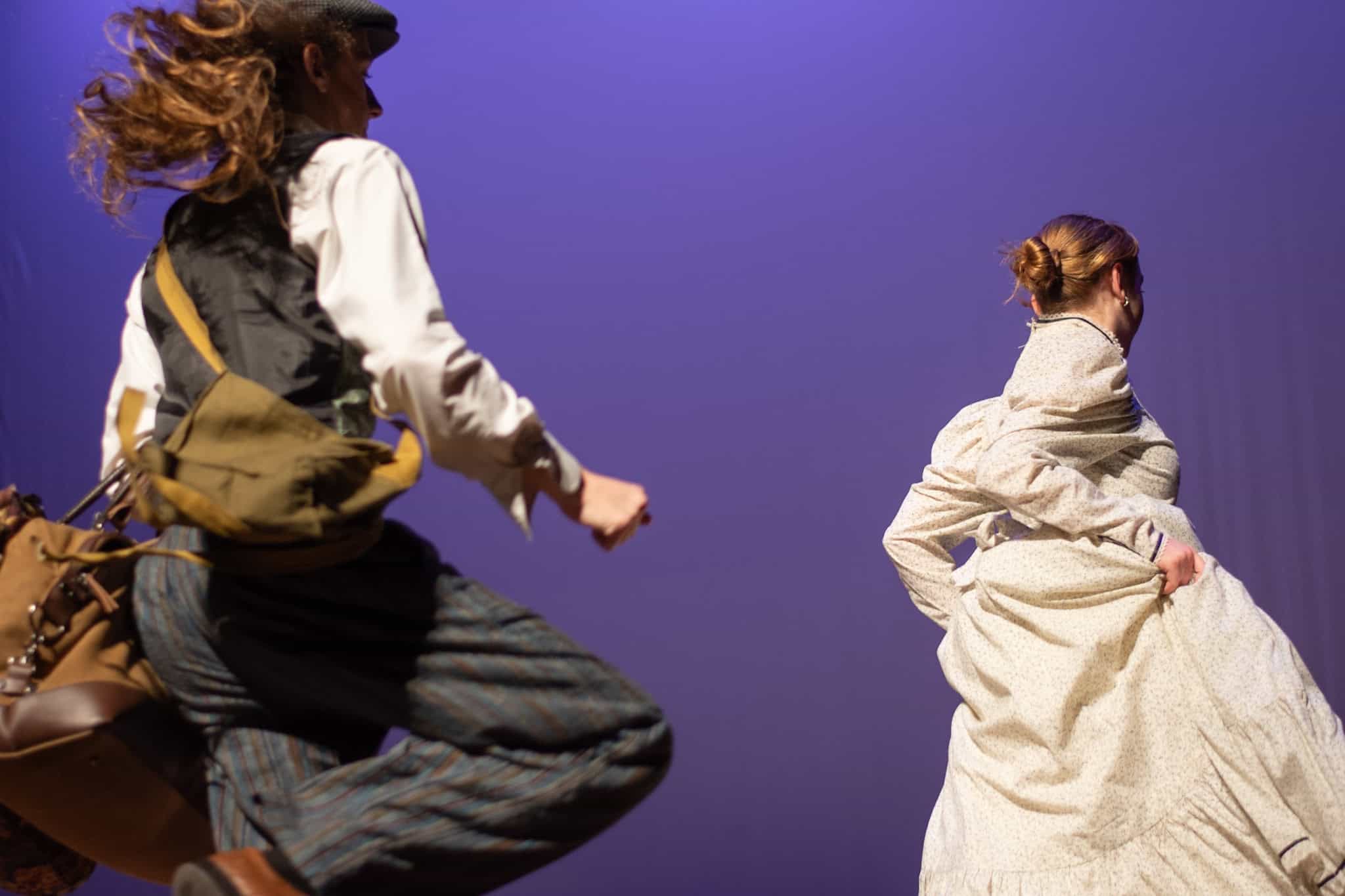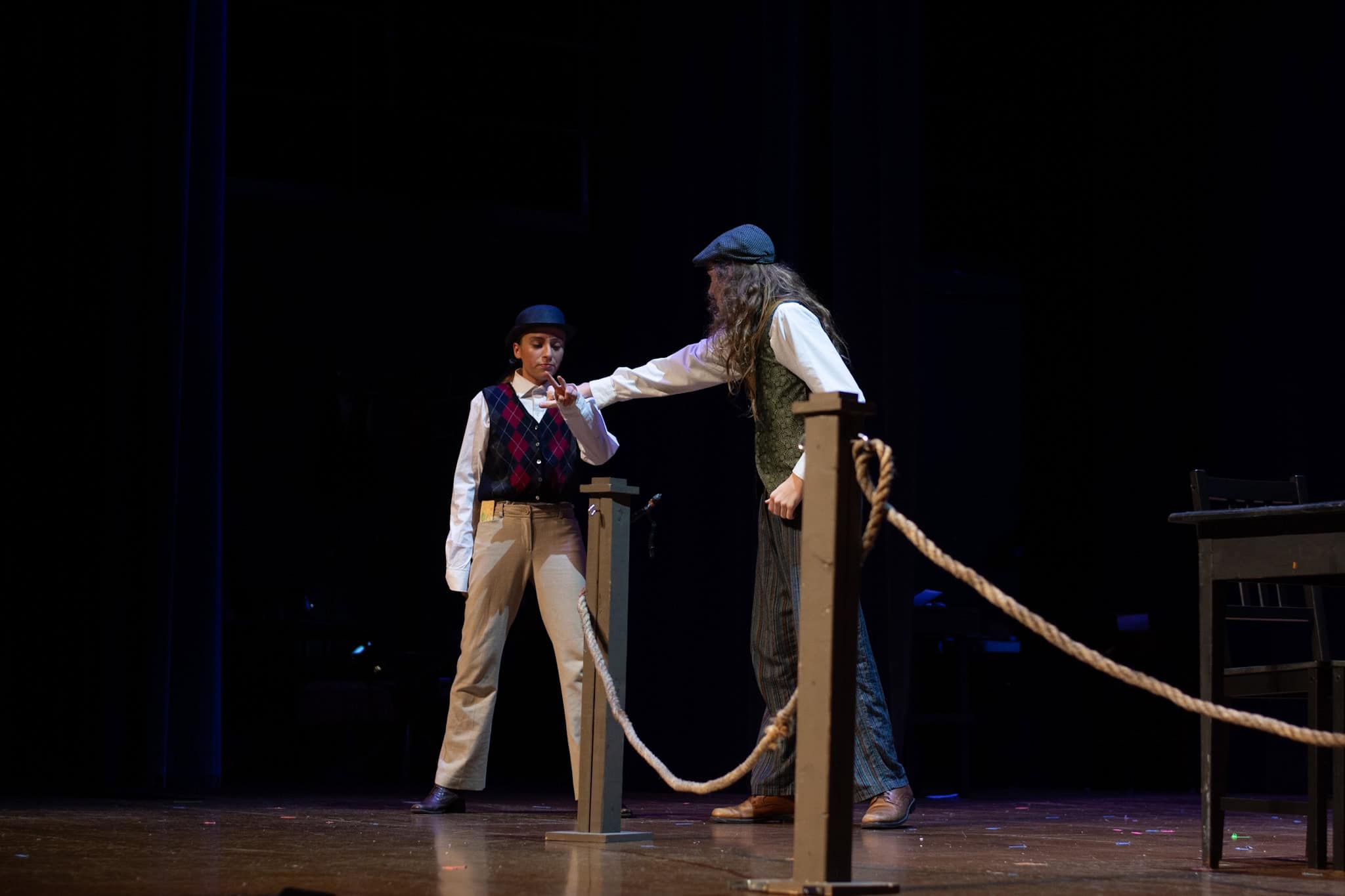 “Uno de mis momentos favoritos fue el bloqueo de la escena de los bandidos en el segundo acto, cuando secuestran a Passepartout. Es un momento tan absurdo. Hay un caballo falso, máscaras, sombreros de vaquero, y los bandidos se llaman John, Johnson, Son, y creo que Johnsonson. Para asegurarnos de que lo teníamos todo controlado y que nadie recibiera un codazo por accidente, lo ensayamos a cámara lenta con todos cayendo al suelo de forma hilarante y gritando '¡Johnson!' a paso de tortuga. Ha sido muy divertido trabajar con los estudiantes y Liz para que los alumnos pudieran encontrar esos momentos absurdos y tomar decisiones divertidas, tanto si al final los incluimos en la obra como si no‘. – Elizabeth Eby, codirectora