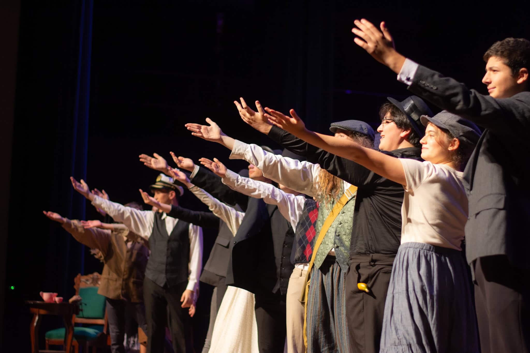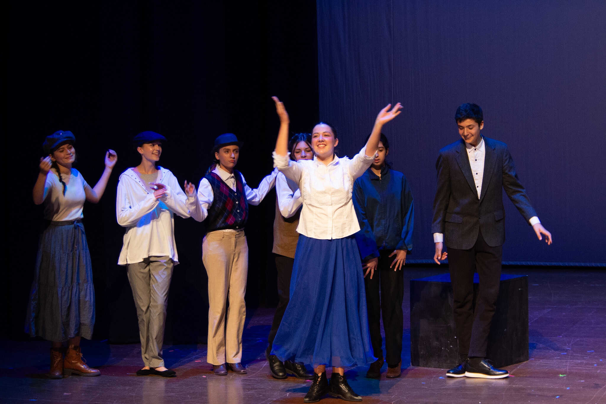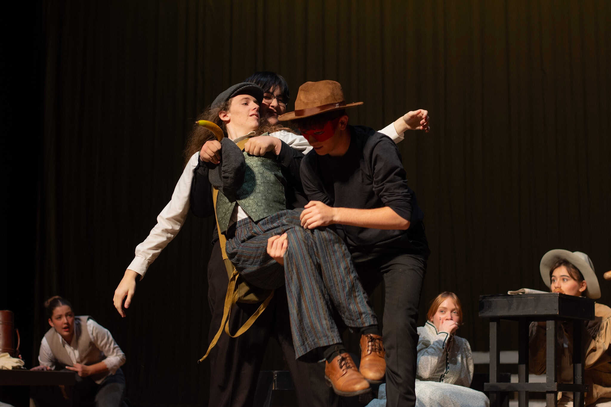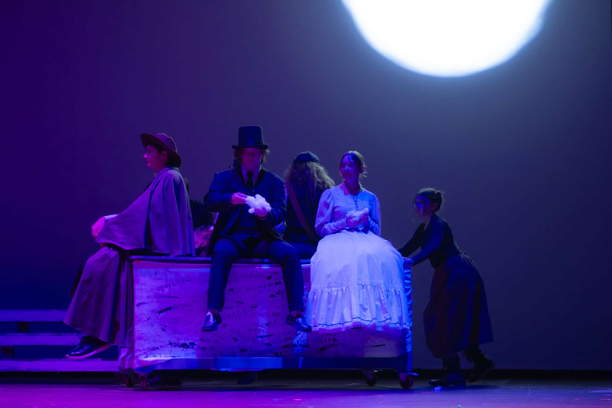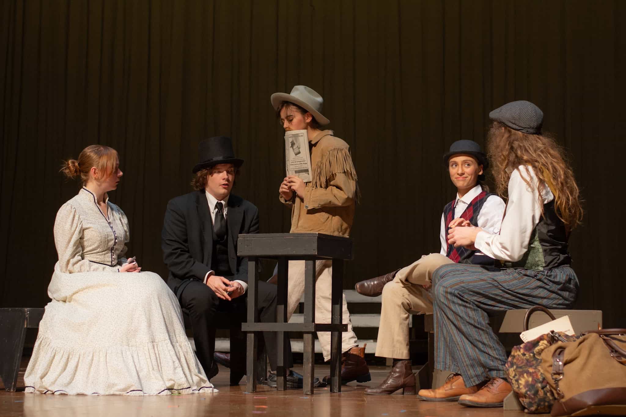 “Uno de mis momentos favoritos fue el bloqueo de la escena de los bandidos en el segundo acto, cuando secuestran a Passepartout. Es un momento tan absurdo. Hay un caballo falso, máscaras, sombreros de vaquero, y los bandidos se llaman John, Johnson, Son, y creo que Johnsonson. Para asegurarnos de que lo teníamos todo controlado y que nadie recibiera un codazo por accidente, lo ensayamos a cámara lenta con todos cayendo al suelo de forma hilarante y gritando '¡Johnson!' a paso de tortuga. Ha sido muy divertido trabajar con los estudiantes y Liz para que los alumnos pudieran encontrar esos momentos absurdos y tomar decisiones divertidas, tanto si al final los incluimos en la obra como si no‘. – Elizabeth Eby, codirectora