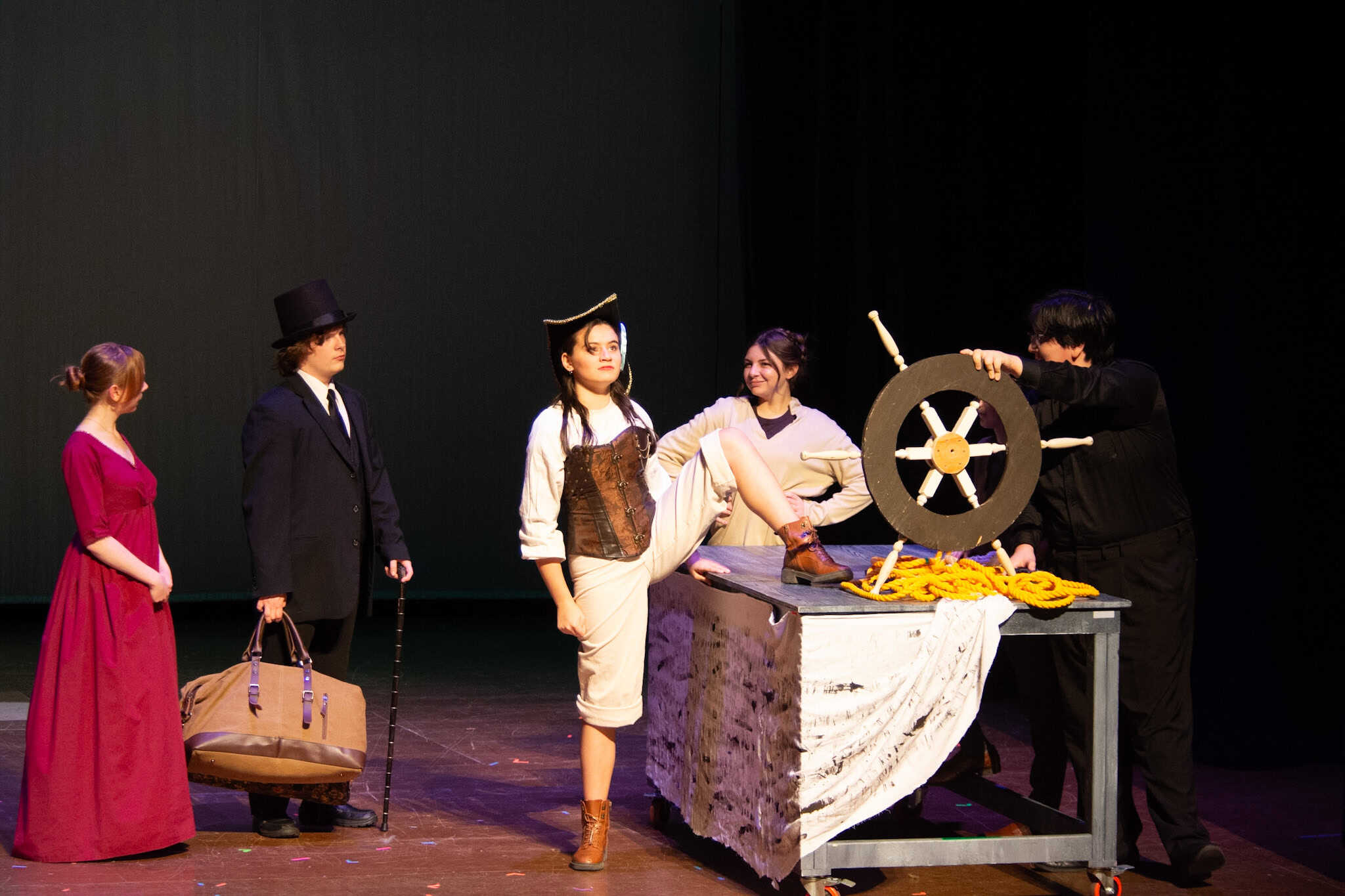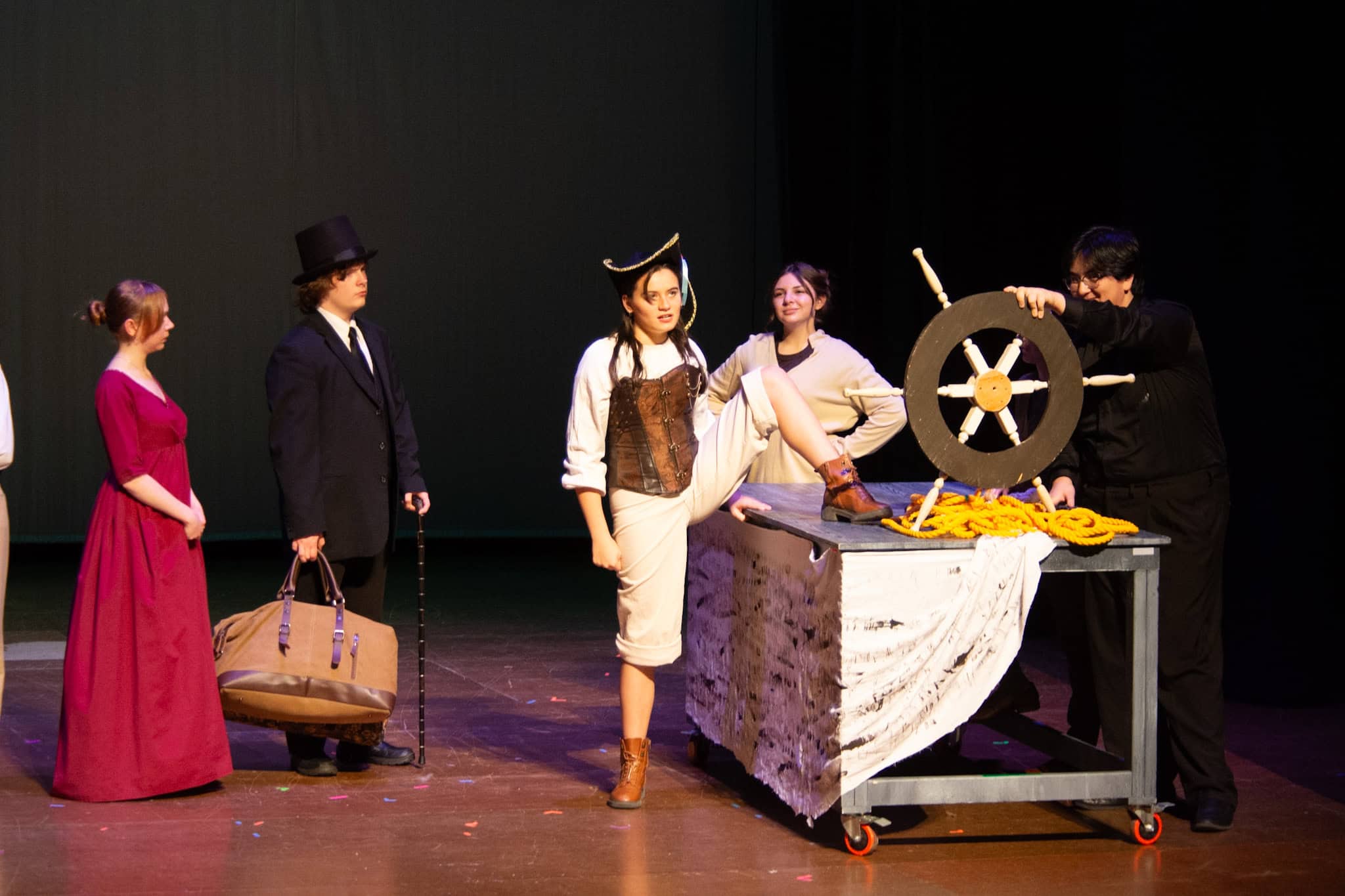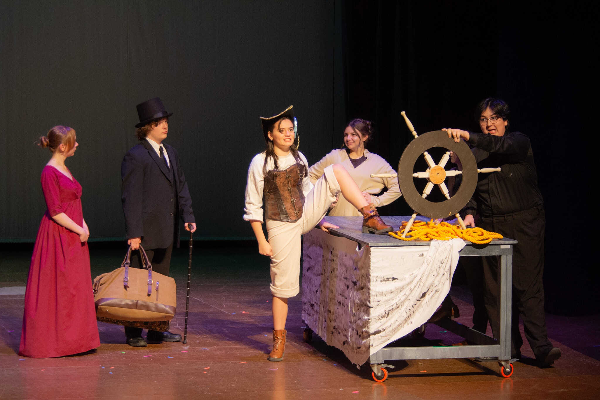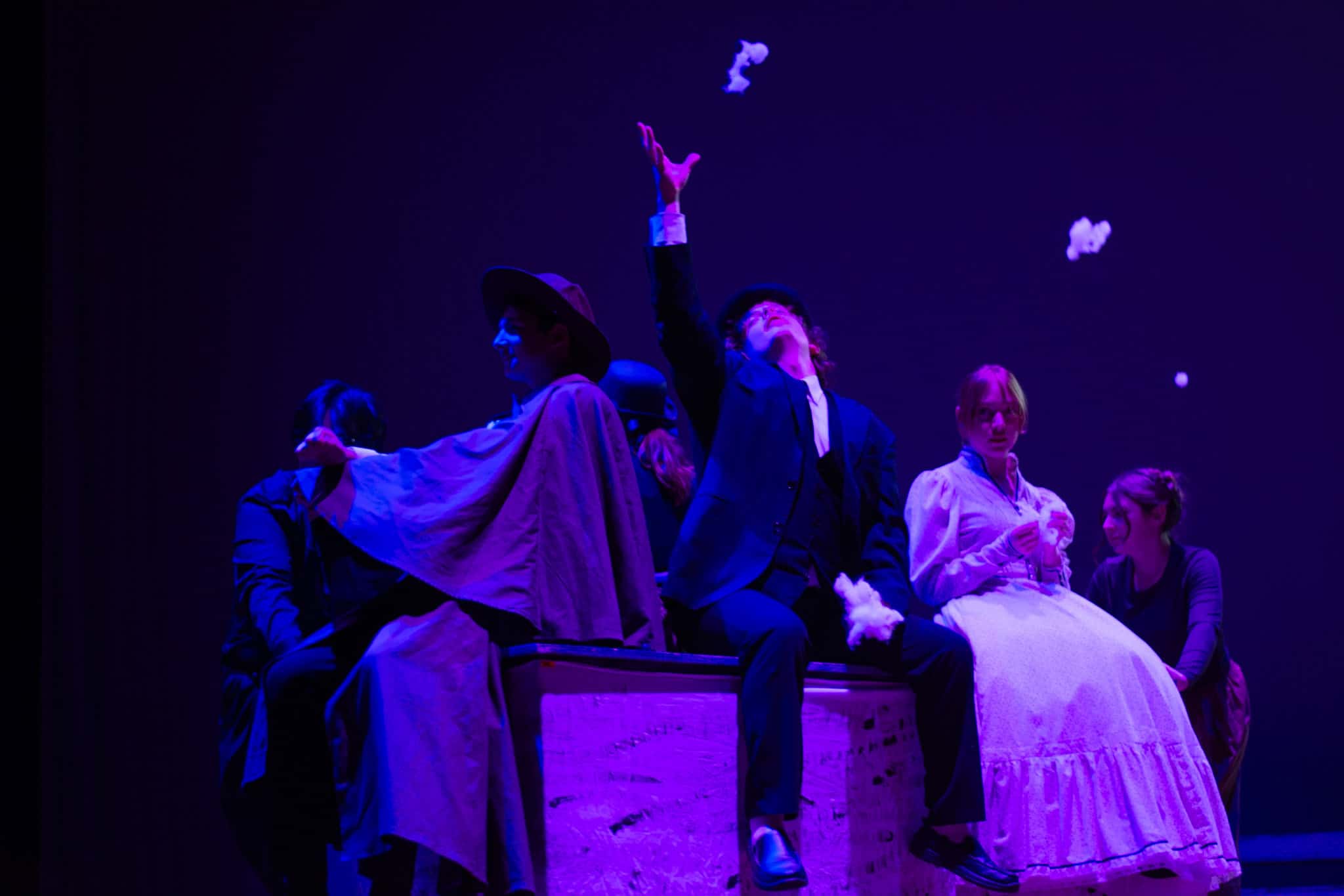 “Uno de mis momentos favoritos fue el bloqueo de la escena de los bandidos en el segundo acto, cuando secuestran a Passepartout. Es un momento tan absurdo. Hay un caballo falso, máscaras, sombreros de vaquero, y los bandidos se llaman John, Johnson, Son, y creo que Johnsonson. Para asegurarnos de que lo teníamos todo controlado y que nadie recibiera un codazo por accidente, lo ensayamos a cámara lenta con todos cayendo al suelo de forma hilarante y gritando '¡Johnson!' a paso de tortuga. Ha sido muy divertido trabajar con los estudiantes y Liz para que los alumnos pudieran encontrar esos momentos absurdos y tomar decisiones divertidas, tanto si al final los incluimos en la obra como si no‘. – Elizabeth Eby, codirectora