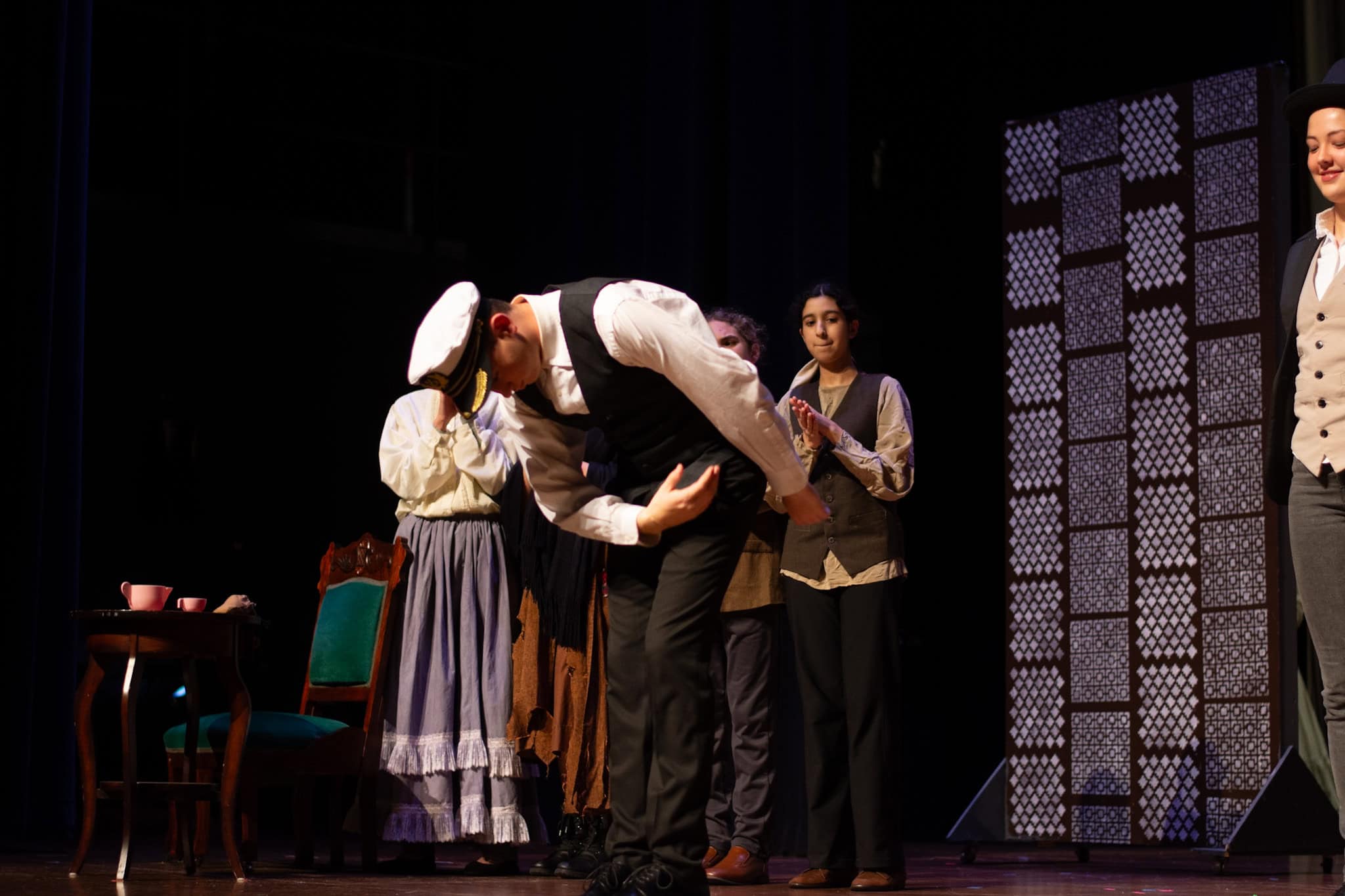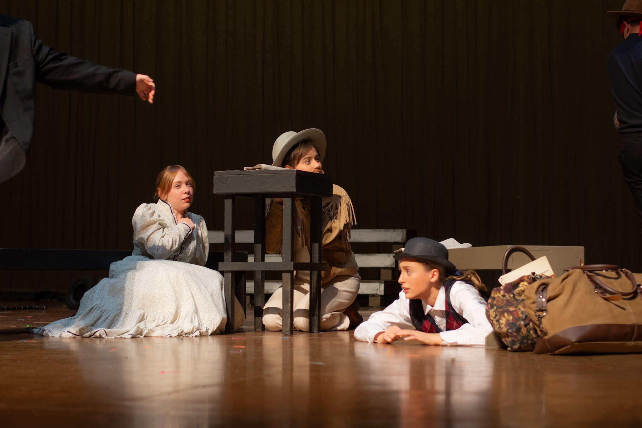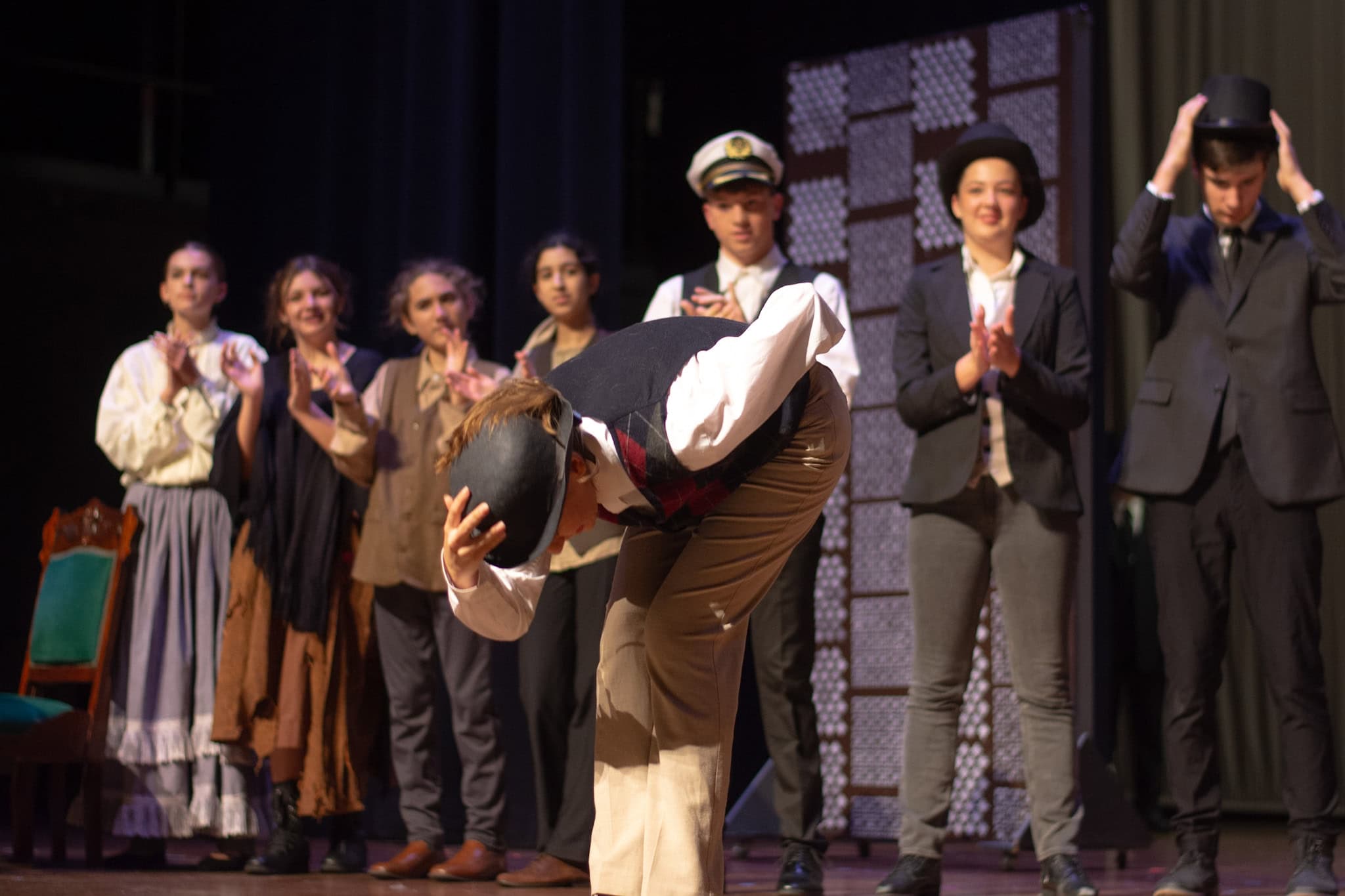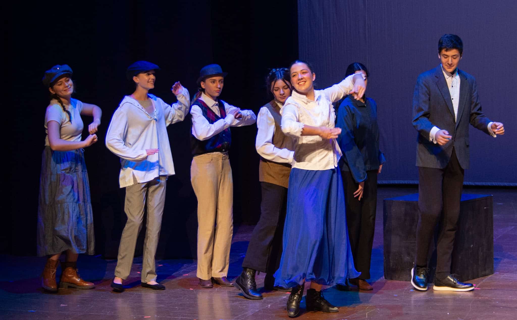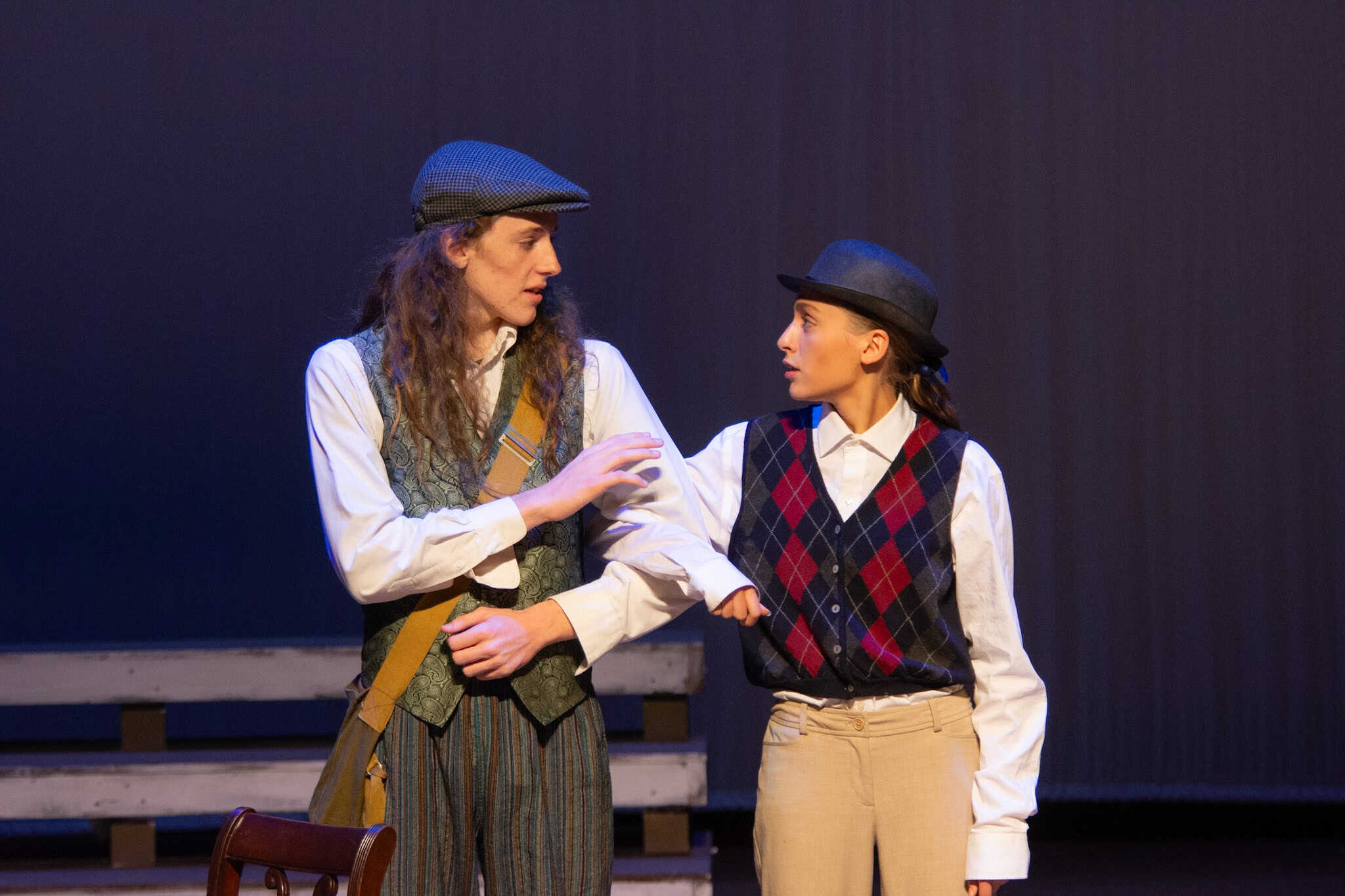 “Uno de mis momentos favoritos fue el bloqueo de la escena de los bandidos en el segundo acto, cuando secuestran a Passepartout. Es un momento tan absurdo. Hay un caballo falso, máscaras, sombreros de vaquero, y los bandidos se llaman John, Johnson, Son, y creo que Johnsonson. Para asegurarnos de que lo teníamos todo controlado y que nadie recibiera un codazo por accidente, lo ensayamos a cámara lenta con todos cayendo al suelo de forma hilarante y gritando '¡Johnson!' a paso de tortuga. Ha sido muy divertido trabajar con los estudiantes y Liz para que los alumnos pudieran encontrar esos momentos absurdos y tomar decisiones divertidas, tanto si al final los incluimos en la obra como si no‘. – Elizabeth Eby, codirectora