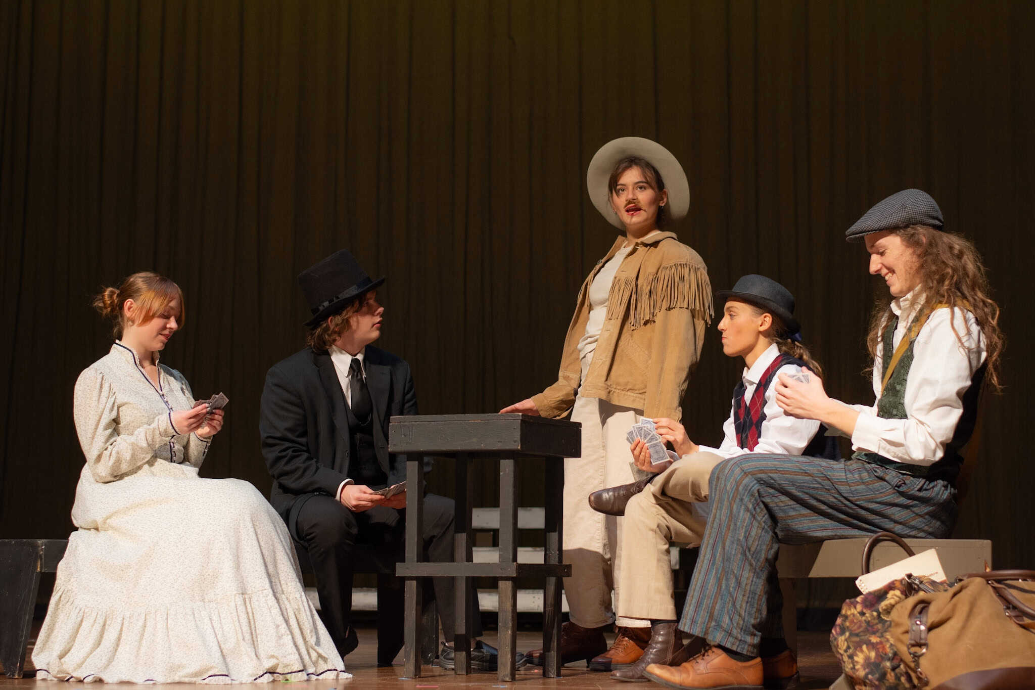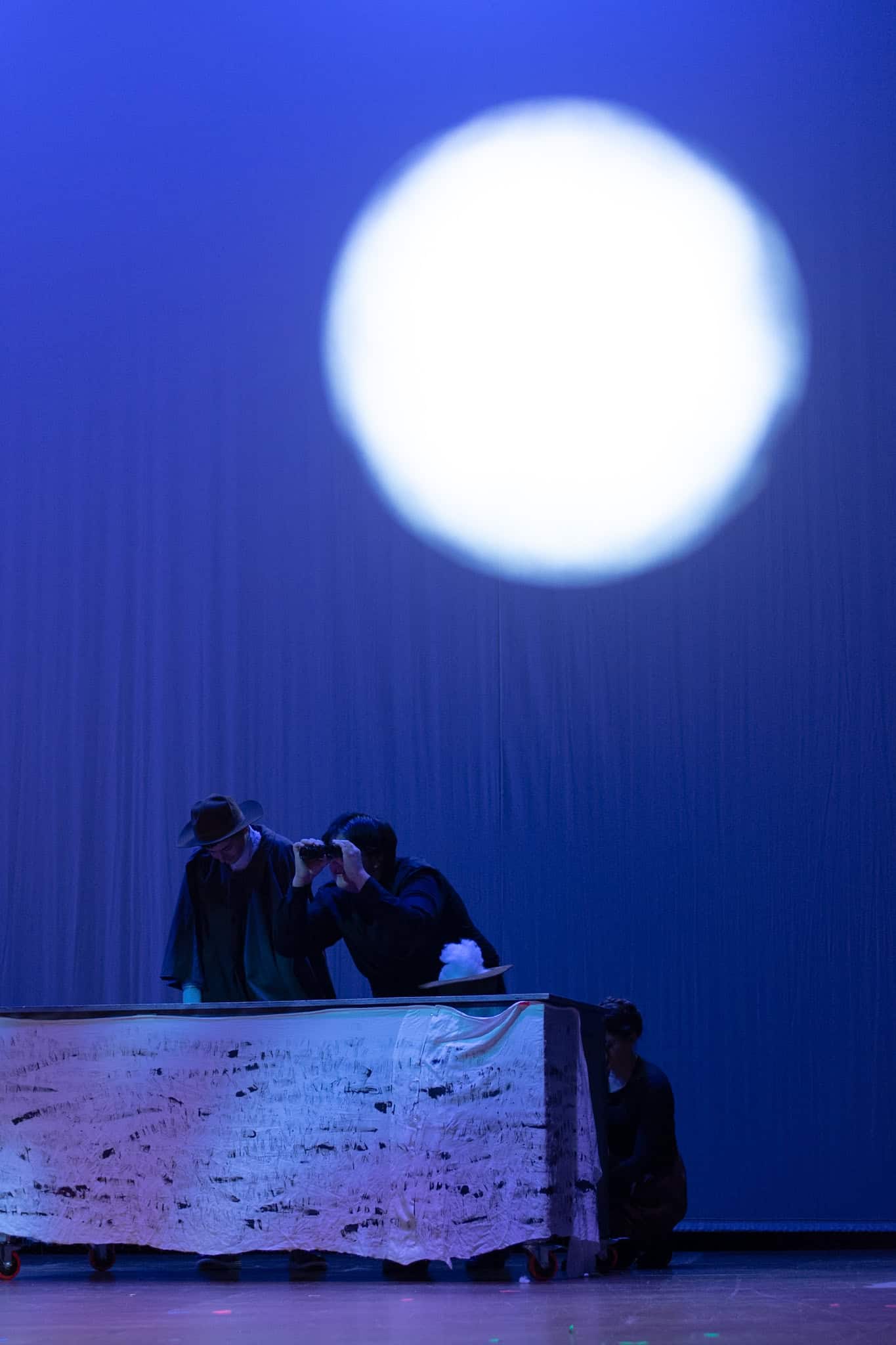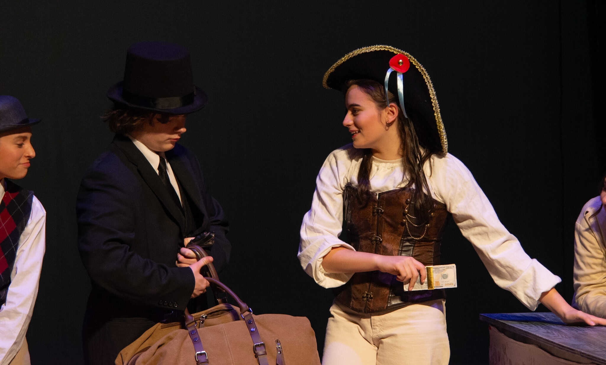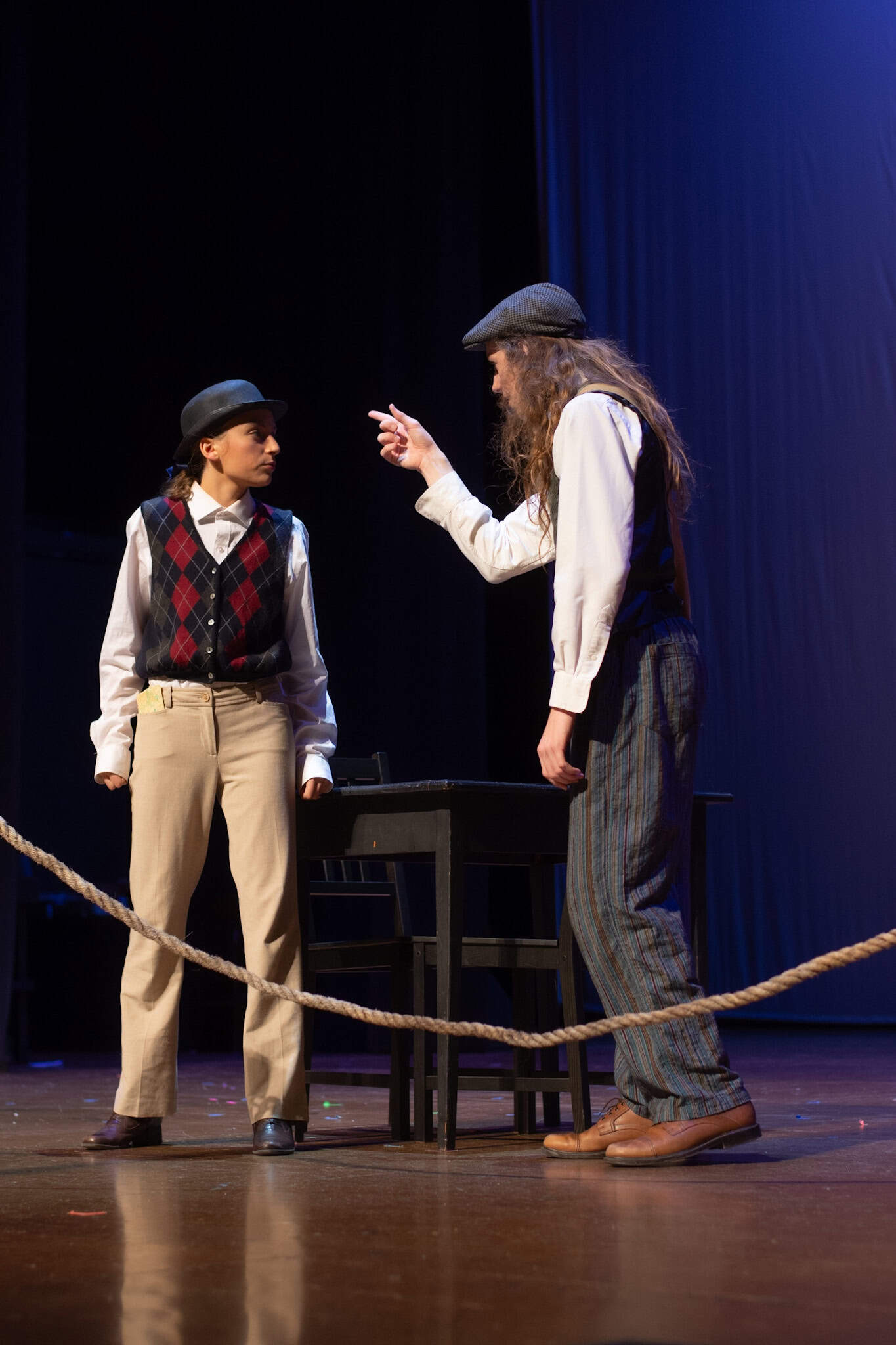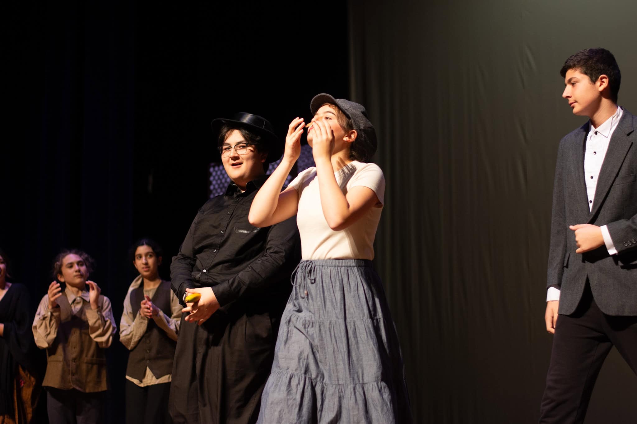 “Uno de mis momentos favoritos fue el bloqueo de la escena de los bandidos en el segundo acto, cuando secuestran a Passepartout. Es un momento tan absurdo. Hay un caballo falso, máscaras, sombreros de vaquero, y los bandidos se llaman John, Johnson, Son, y creo que Johnsonson. Para asegurarnos de que lo teníamos todo controlado y que nadie recibiera un codazo por accidente, lo ensayamos a cámara lenta con todos cayendo al suelo de forma hilarante y gritando '¡Johnson!' a paso de tortuga. Ha sido muy divertido trabajar con los estudiantes y Liz para que los alumnos pudieran encontrar esos momentos absurdos y tomar decisiones divertidas, tanto si al final los incluimos en la obra como si no‘. – Elizabeth Eby, codirectora