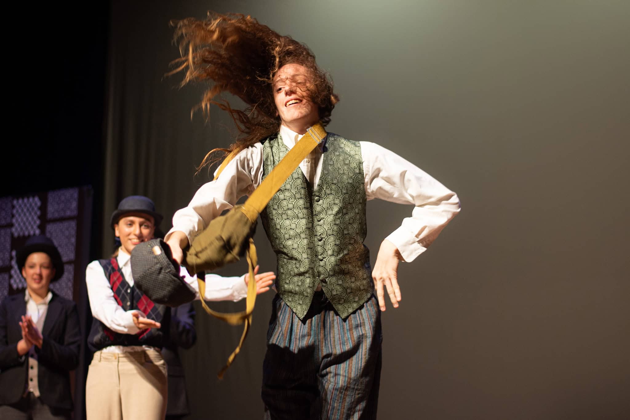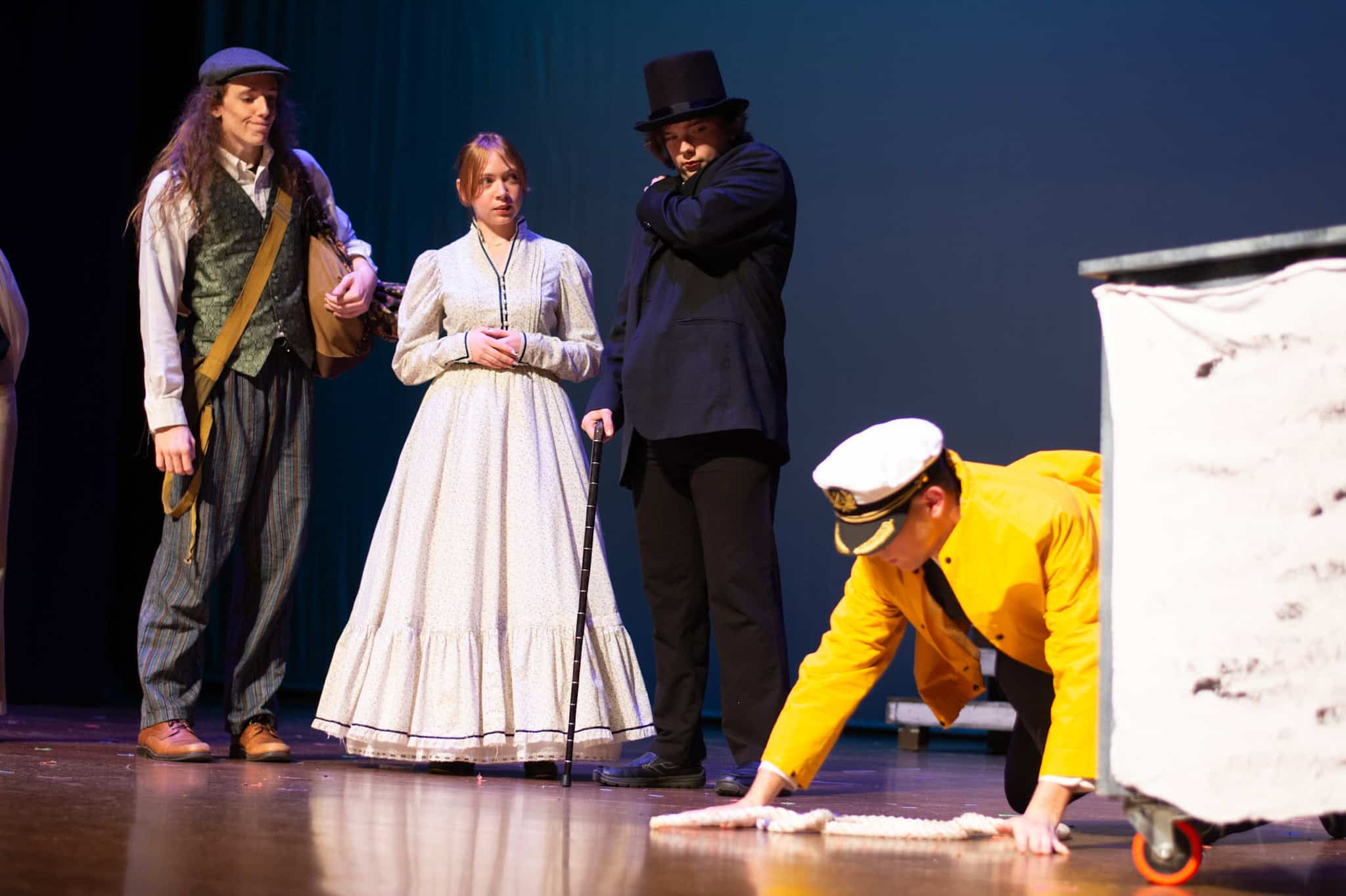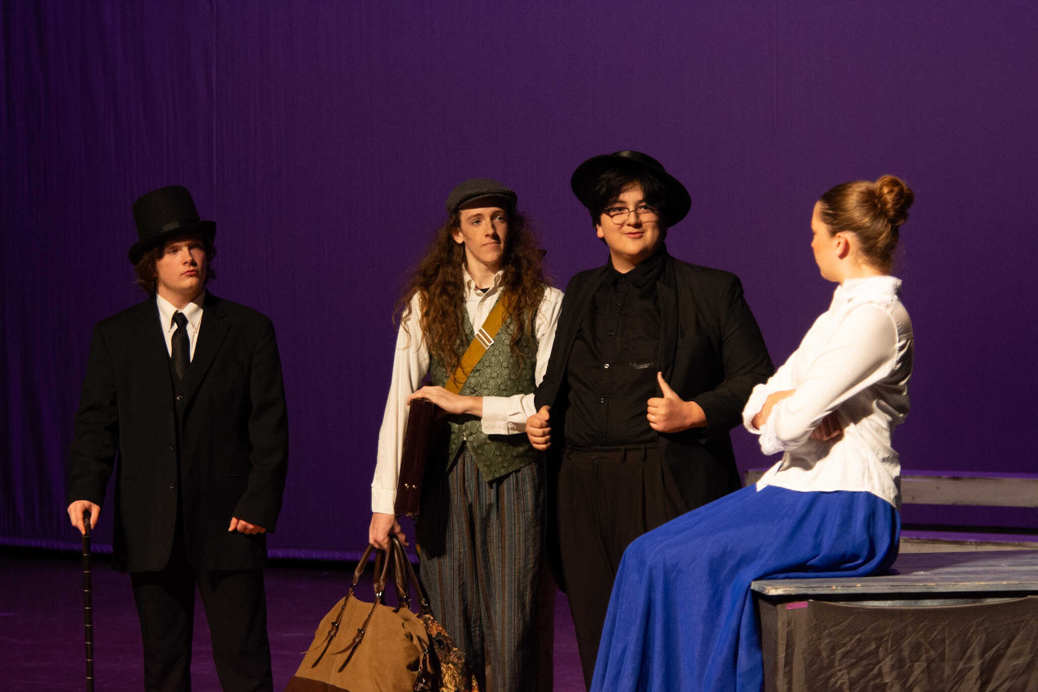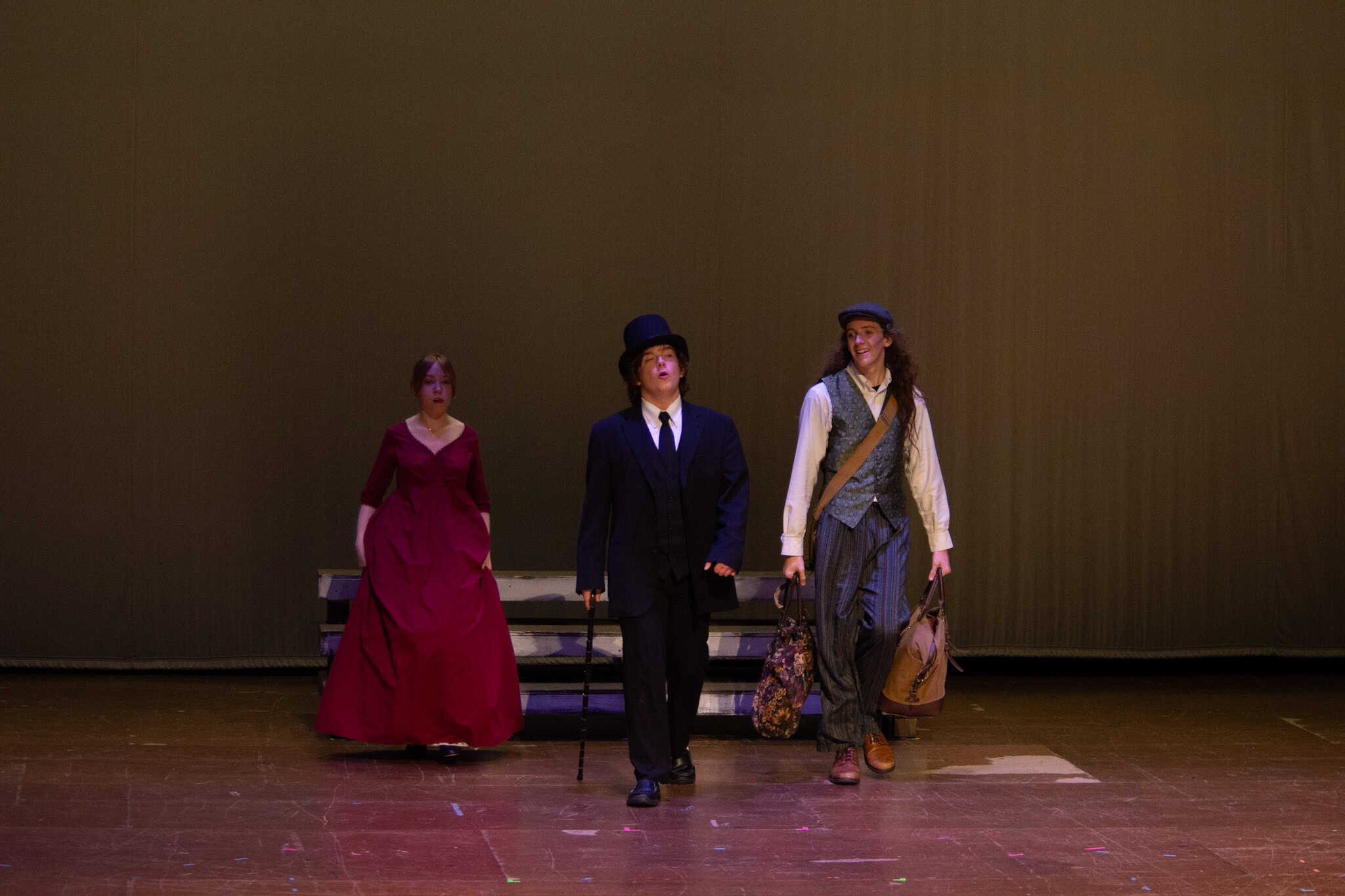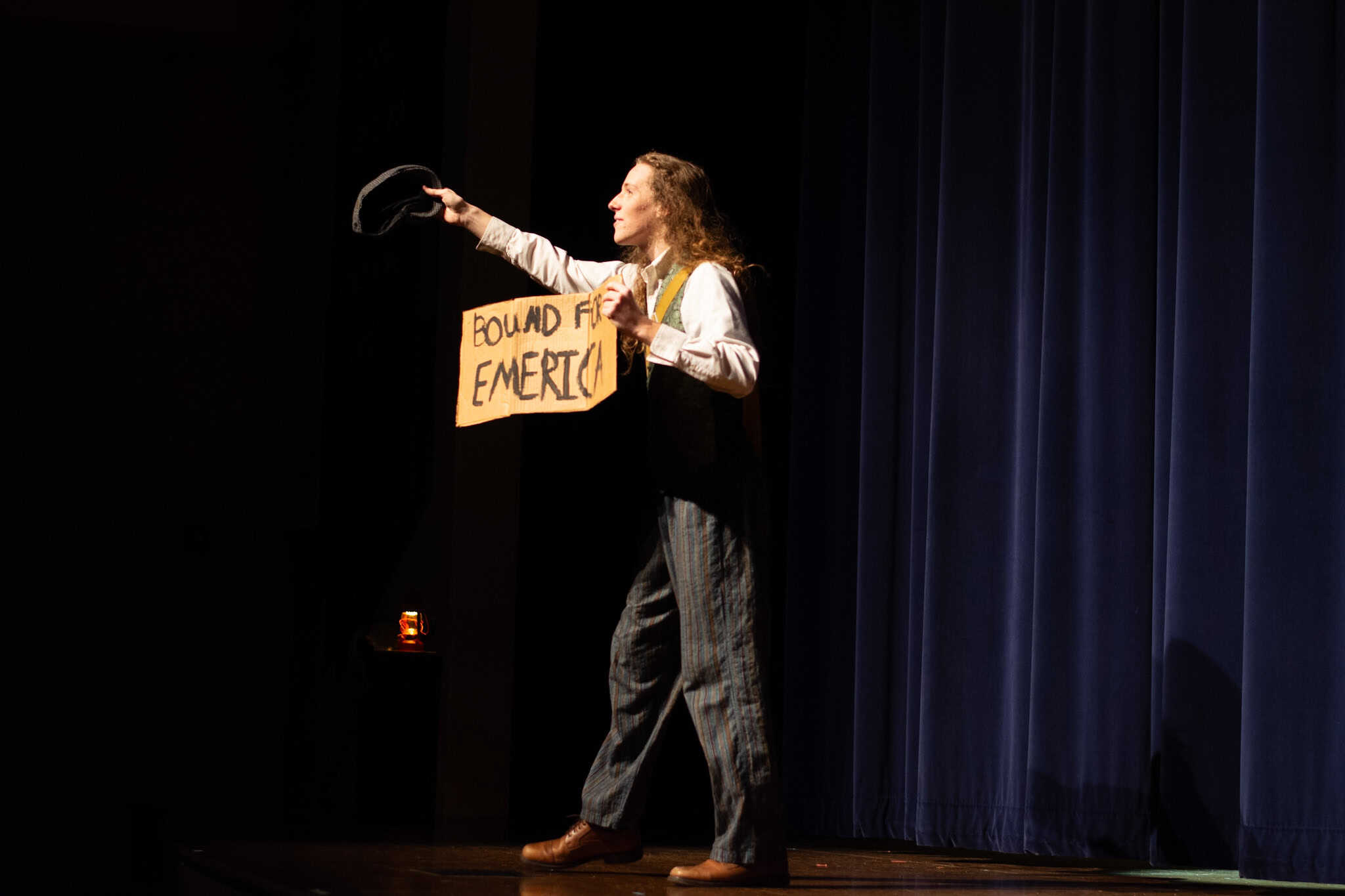 “Uno de mis momentos favoritos fue el bloqueo de la escena de los bandidos en el segundo acto, cuando secuestran a Passepartout. Es un momento tan absurdo. Hay un caballo falso, máscaras, sombreros de vaquero, y los bandidos se llaman John, Johnson, Son, y creo que Johnsonson. Para asegurarnos de que lo teníamos todo controlado y que nadie recibiera un codazo por accidente, lo ensayamos a cámara lenta con todos cayendo al suelo de forma hilarante y gritando '¡Johnson!' a paso de tortuga. Ha sido muy divertido trabajar con los estudiantes y Liz para que los alumnos pudieran encontrar esos momentos absurdos y tomar decisiones divertidas, tanto si al final los incluimos en la obra como si no‘. – Elizabeth Eby, codirectora