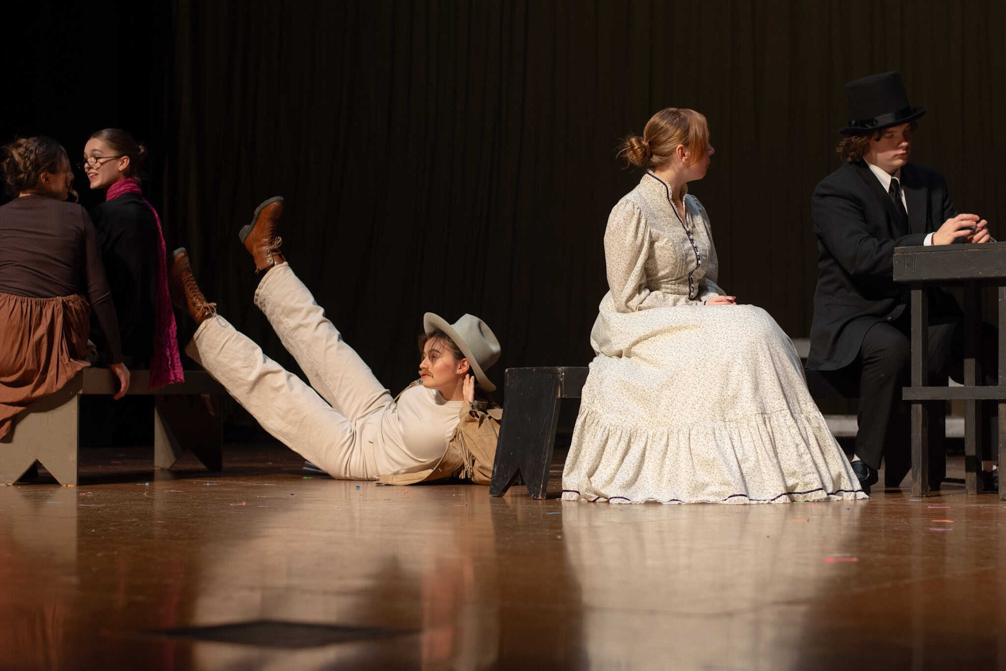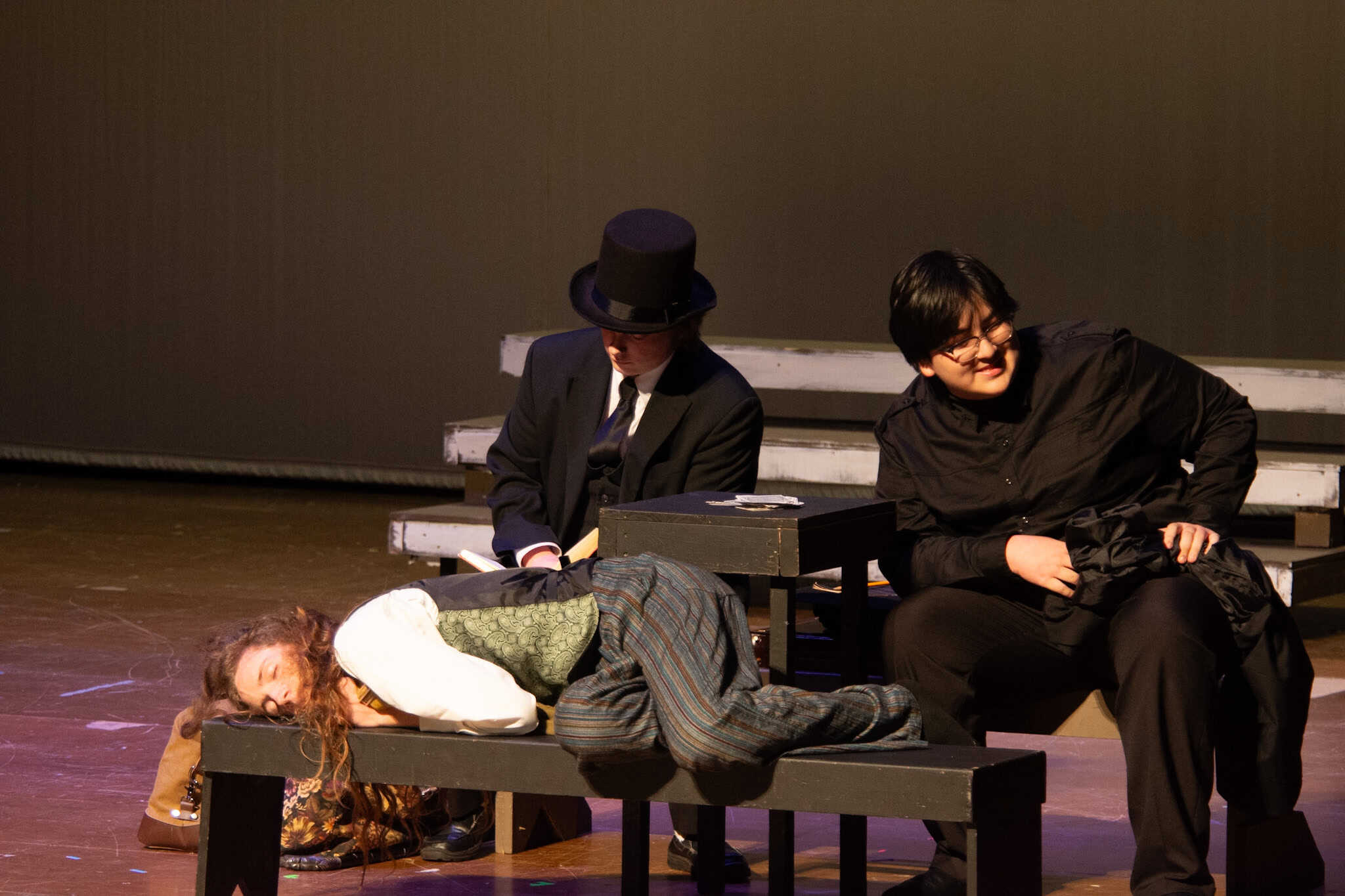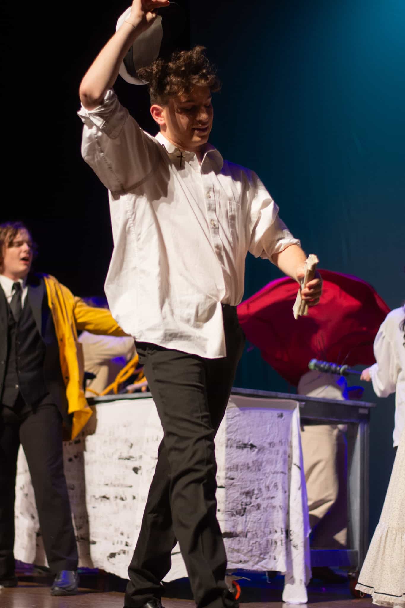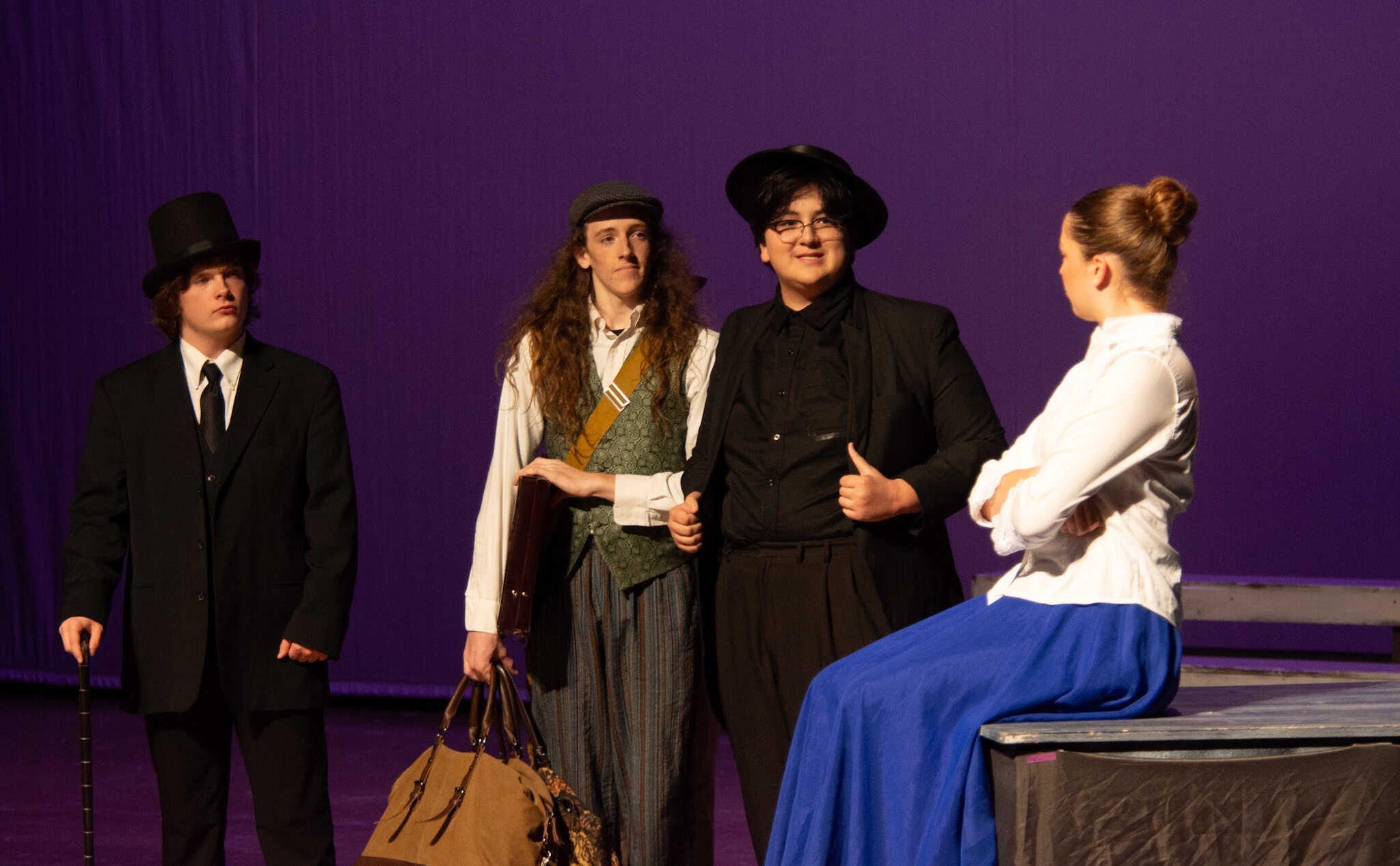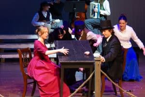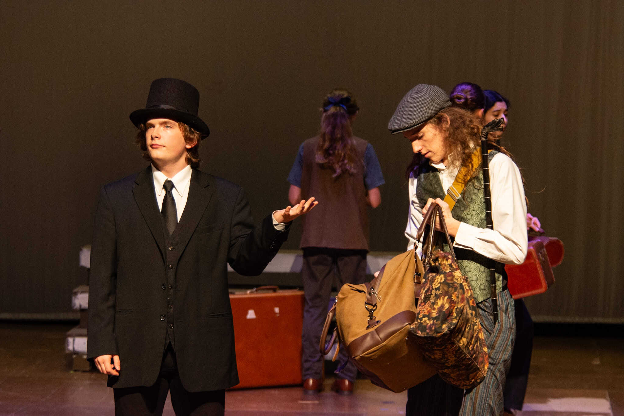 “Uno de mis momentos favoritos fue el bloqueo de la escena de los bandidos en el segundo acto, cuando secuestran a Passepartout. Es un momento tan absurdo. Hay un caballo falso, máscaras, sombreros de vaquero, y los bandidos se llaman John, Johnson, Son, y creo que Johnsonson. Para asegurarnos de que lo teníamos todo controlado y que nadie recibiera un codazo por accidente, lo ensayamos a cámara lenta con todos cayendo al suelo de forma hilarante y gritando '¡Johnson!' a paso de tortuga. Ha sido muy divertido trabajar con los estudiantes y Liz para que los alumnos pudieran encontrar esos momentos absurdos y tomar decisiones divertidas, tanto si al final los incluimos en la obra como si no‘. – Elizabeth Eby, codirectora