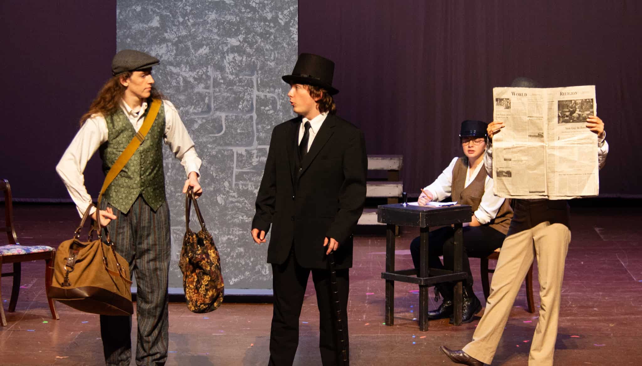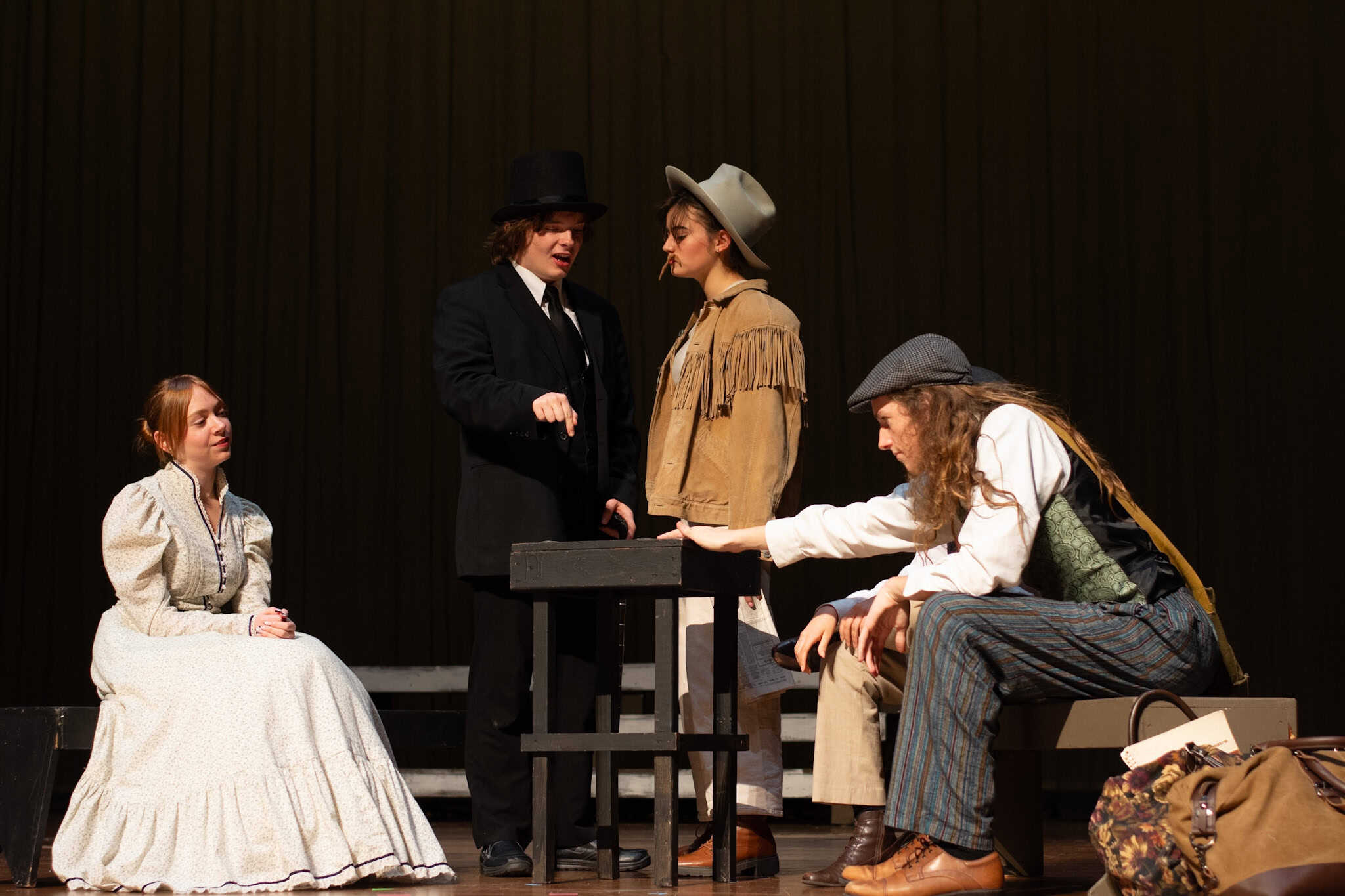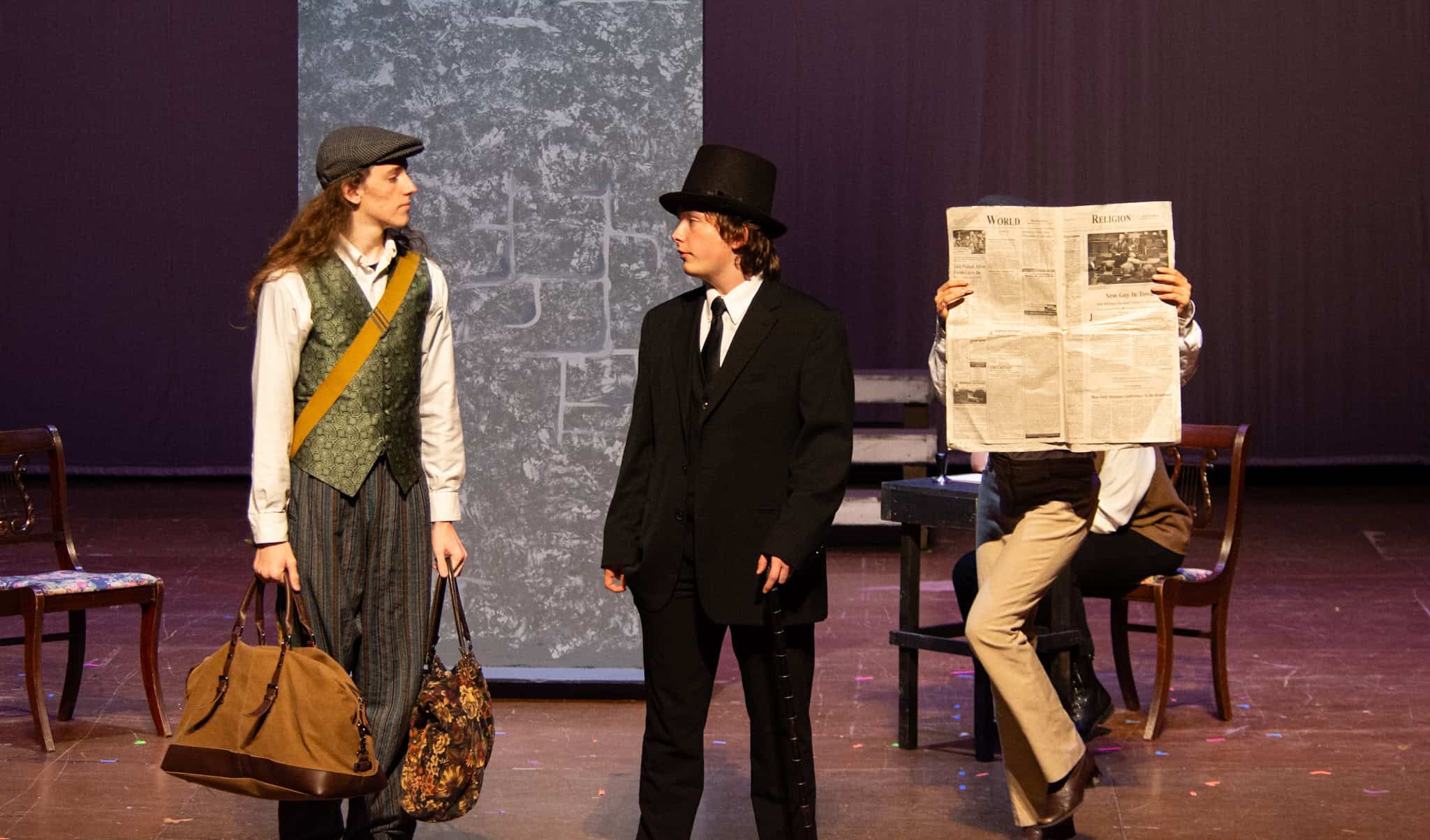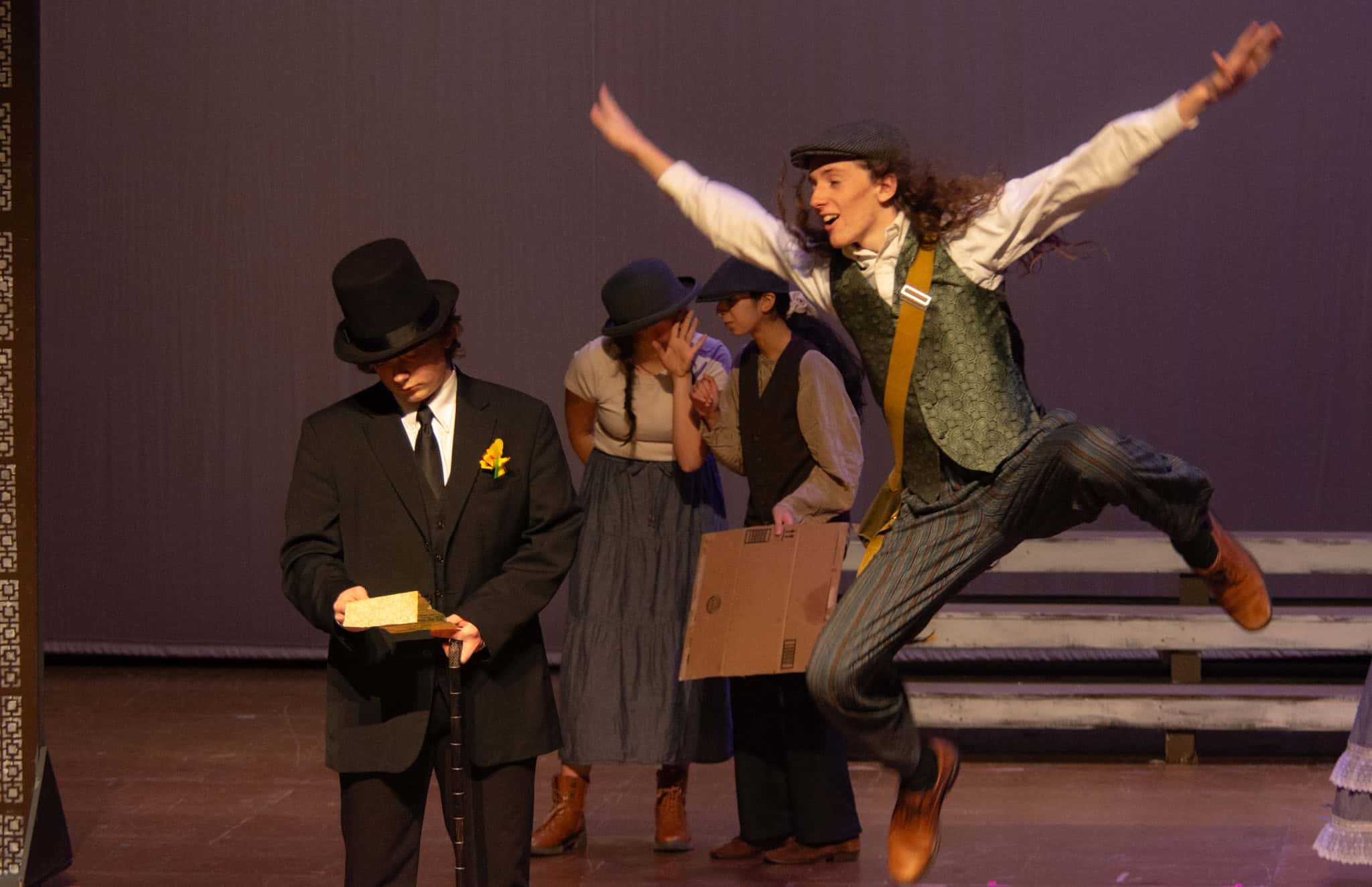 “Uno de mis momentos favoritos fue el bloqueo de la escena de los bandidos en el segundo acto, cuando secuestran a Passepartout. Es un momento tan absurdo. Hay un caballo falso, máscaras, sombreros de vaquero, y los bandidos se llaman John, Johnson, Son, y creo que Johnsonson. Para asegurarnos de que lo teníamos todo controlado y que nadie recibiera un codazo por accidente, lo ensayamos a cámara lenta con todos cayendo al suelo de forma hilarante y gritando '¡Johnson!' a paso de tortuga. Ha sido muy divertido trabajar con los estudiantes y Liz para que los alumnos pudieran encontrar esos momentos absurdos y tomar decisiones divertidas, tanto si al final los incluimos en la obra como si no‘. – Elizabeth Eby, codirectora