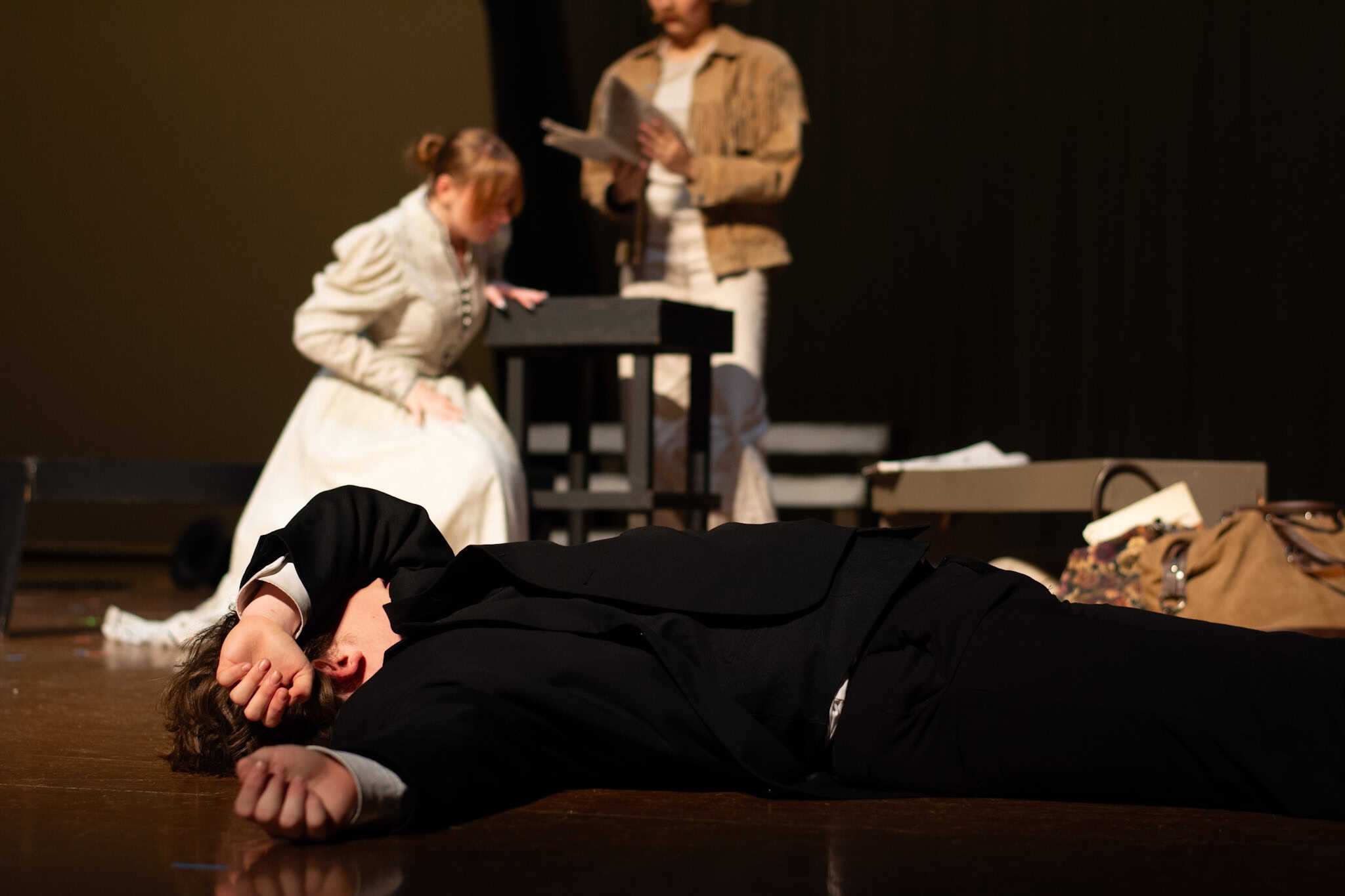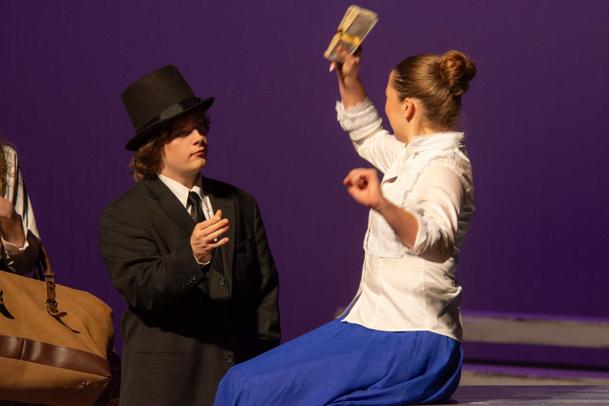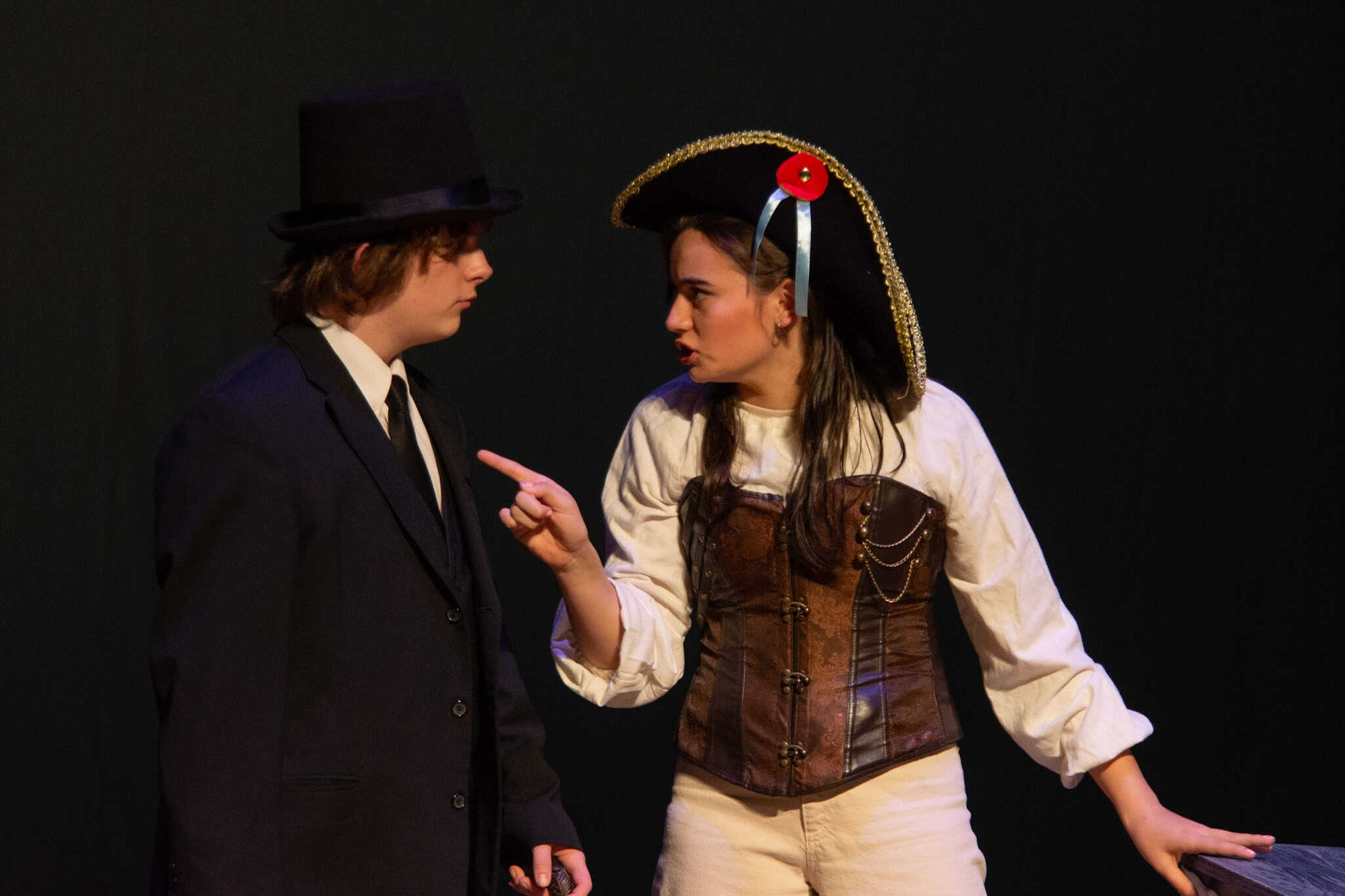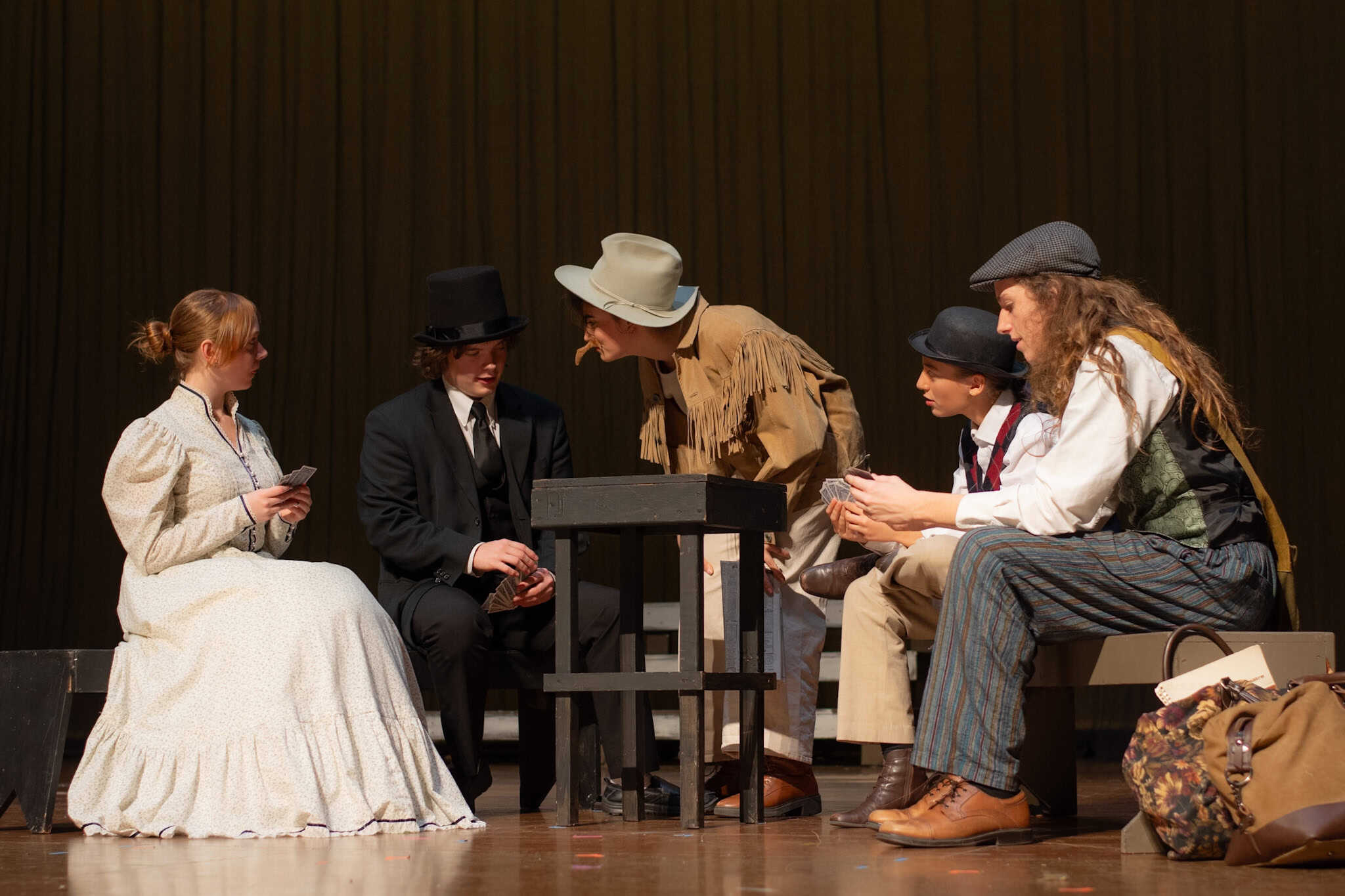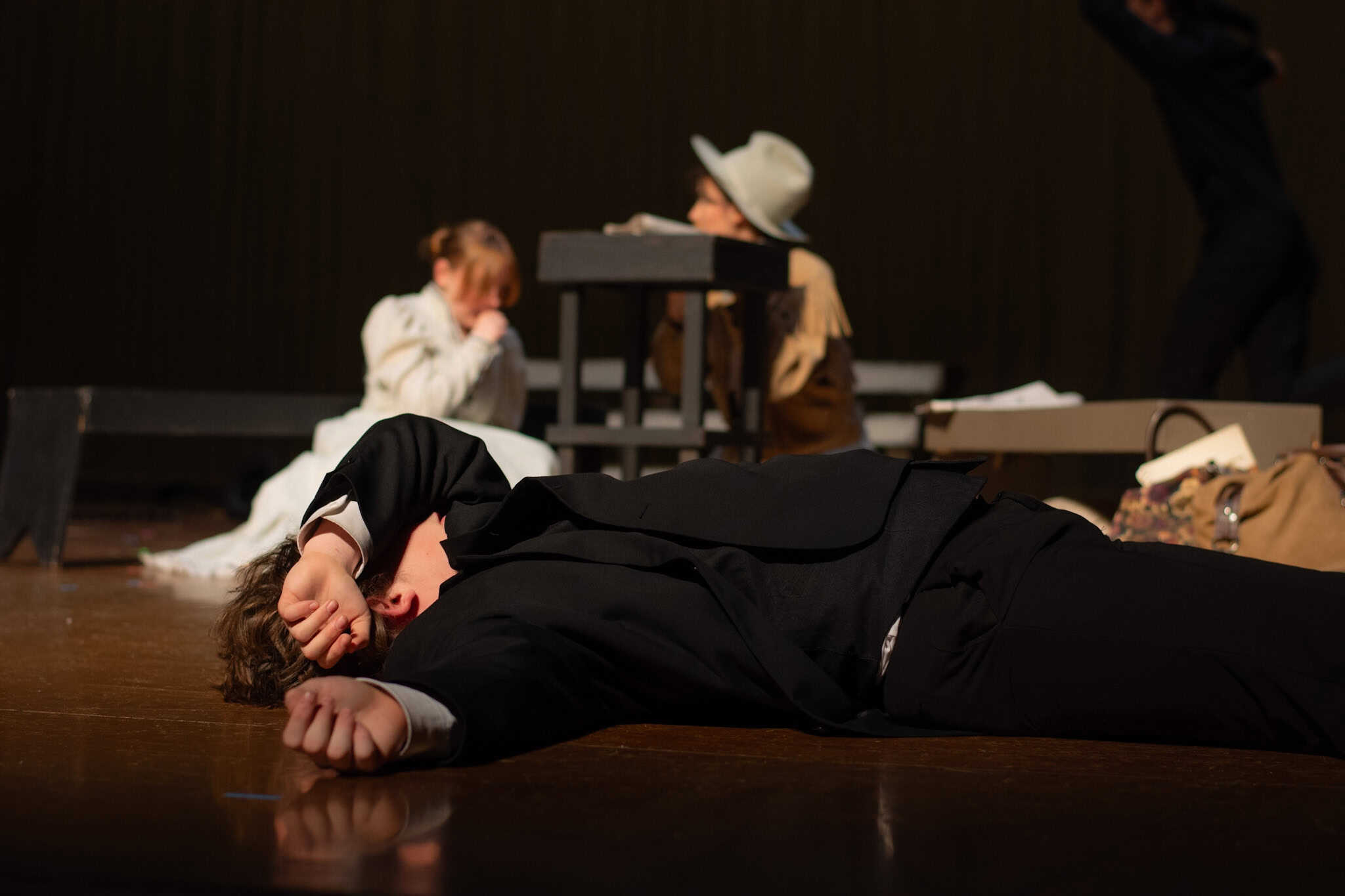 “Uno de mis momentos favoritos fue el bloqueo de la escena de los bandidos en el segundo acto, cuando secuestran a Passepartout. Es un momento tan absurdo. Hay un caballo falso, máscaras, sombreros de vaquero, y los bandidos se llaman John, Johnson, Son, y creo que Johnsonson. Para asegurarnos de que lo teníamos todo controlado y que nadie recibiera un codazo por accidente, lo ensayamos a cámara lenta con todos cayendo al suelo de forma hilarante y gritando '¡Johnson!' a paso de tortuga. Ha sido muy divertido trabajar con los estudiantes y Liz para que los alumnos pudieran encontrar esos momentos absurdos y tomar decisiones divertidas, tanto si al final los incluimos en la obra como si no‘. – Elizabeth Eby, codirectora