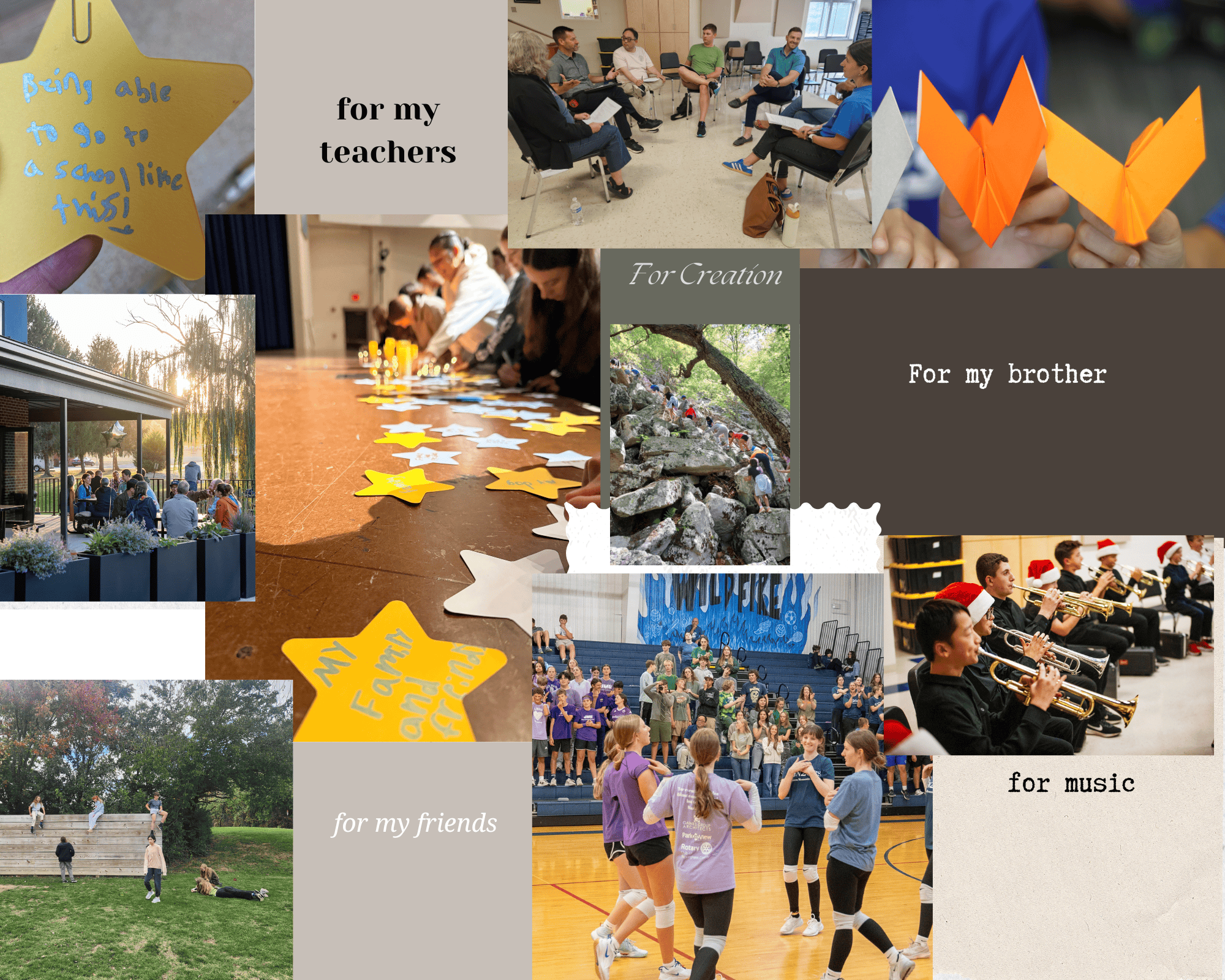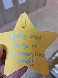 El lunes, en la capilla, estudiantes, personal y profesores hicieron precisamente eso: expresaron su gratitud por las cosas grandes y pequeñas que agradecen. Ejemplos de estas expresiones de gratitud incluyen: "Mi hermano, poder ir a una escuela como esta, mi mamá". Esas estrellas ahora adornan nuestros pasillos, y al entrar en la temporada de Adviento, nos recordarán quiénes somos juntos y qué valoramos.