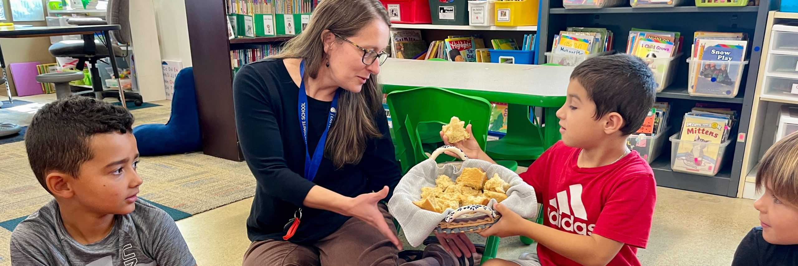 - Los estudiantes de quinto grado se turnan para el almuerzo con la clase de kindergarten ayudando con el uso del microondas, abriendo contenedores rebeldes y administrando el espacio personal.