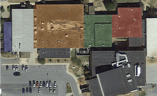 The colored sections are older parts of the roof which were replaced. Blue section: 2000 sq ft. Orange section: 18,000 sq ft. Green section: 7300 sq ft. Red section: 7200 sq ft. Total: 34,500 sq ft