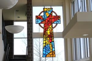 ??Broken??, a 12’ by 6’ stained glass cross created by Jerry Holsopple, found a new home in the naturally lit auditorium foyer at Eastern Mennonite School during Holy Week, bringing new beauty, light, and sacredness to the space. Hanging and installing the 500 lb. piece took 10 men and a hydraulic lift with a gentle…