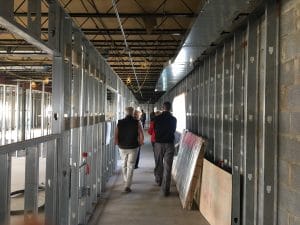 Board members, donors, faculty and staff left blessings during a walk through of the the building renovation for Eastern Mennonite Elementary School on April 1, 2019. Mike Stoltzfus, director of business affairs, answered questions as visitors got a first-hand look at the progress of the renovation of the former MennoMedia building, which the school purchased…